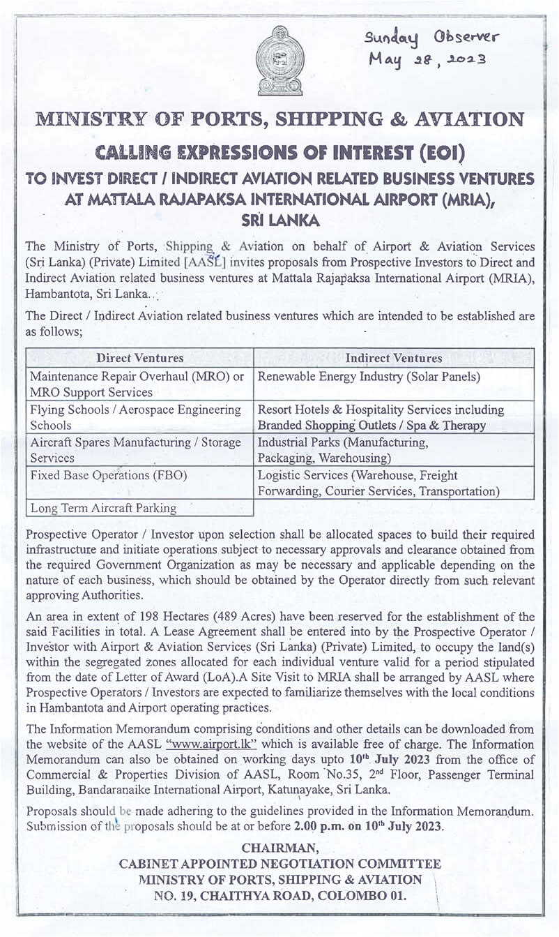 Ministry of Ports, Shipping and Aviation calling Expression of Interest (EOI) to invest Direct/Indirect Aviation related business ventures at Mattala Rajapaksa International Airport (MRIA) Hambantota, Sri Lanka.