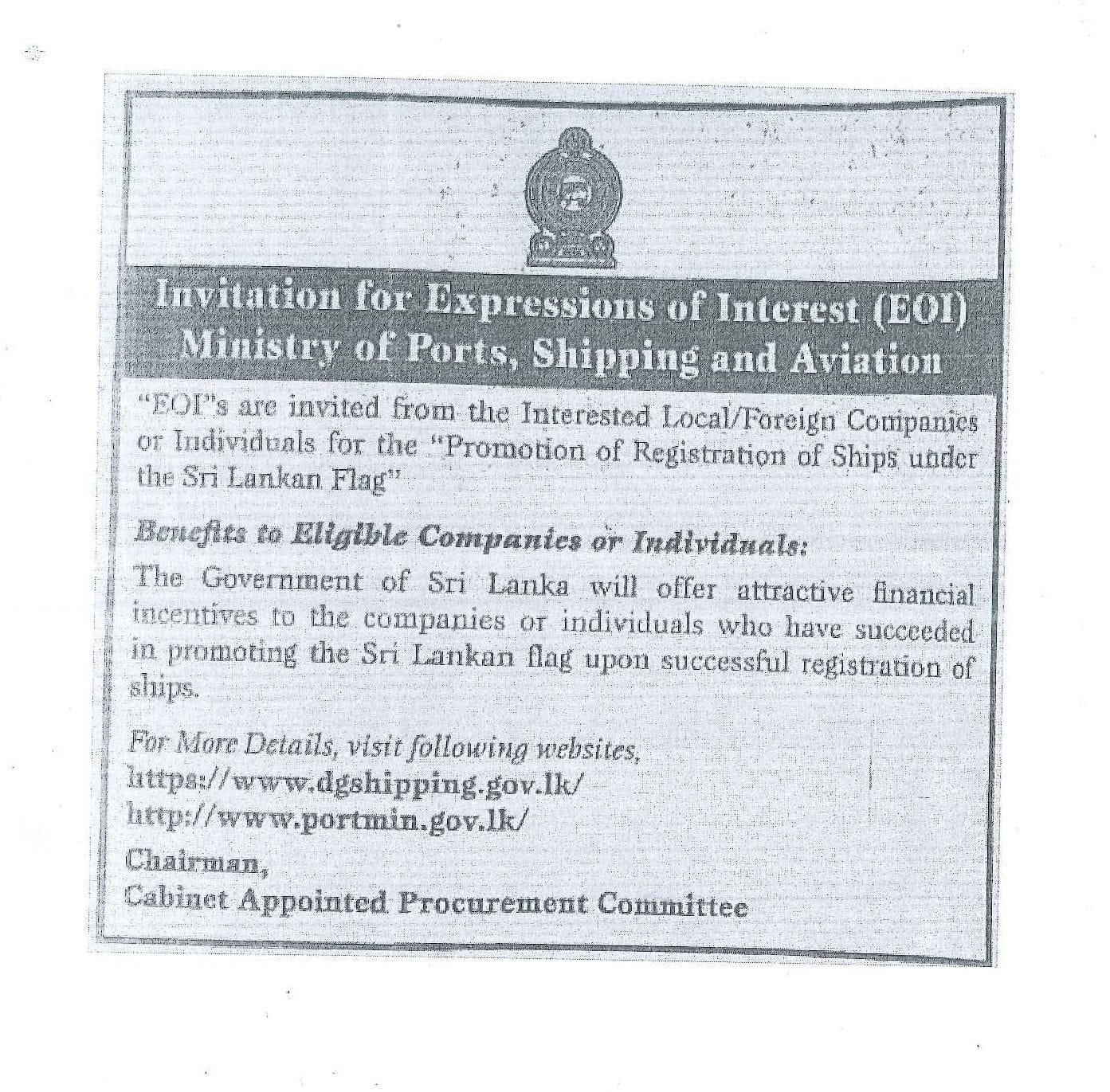 Ministry of Ports, Shipping & Aviation of Sri Lanka is calling of Expression of Interest (EOI) for the promotion of Registration of Vessel under the flag of Sri Lanka. [To see the document (PLEASE CLICK HERE)]