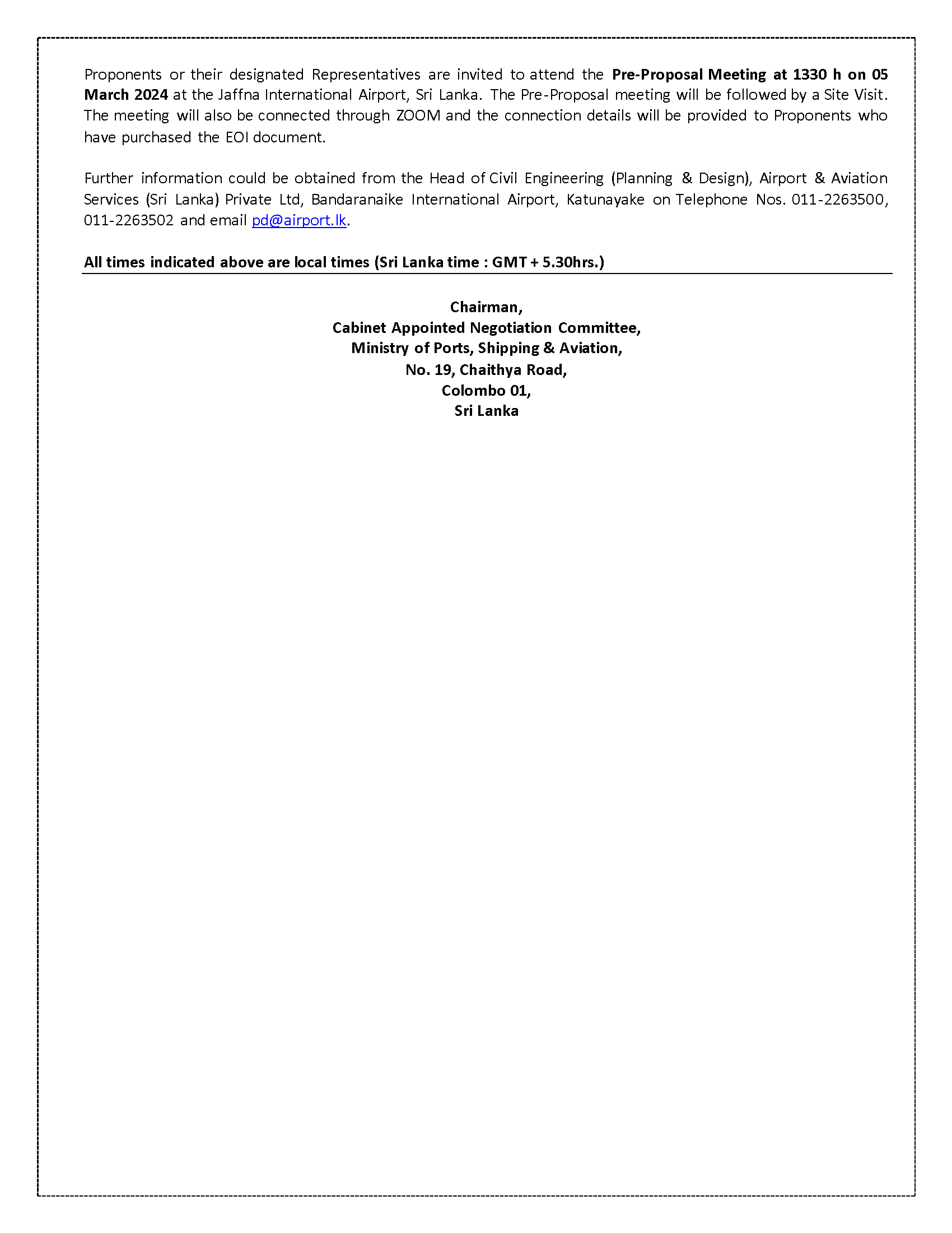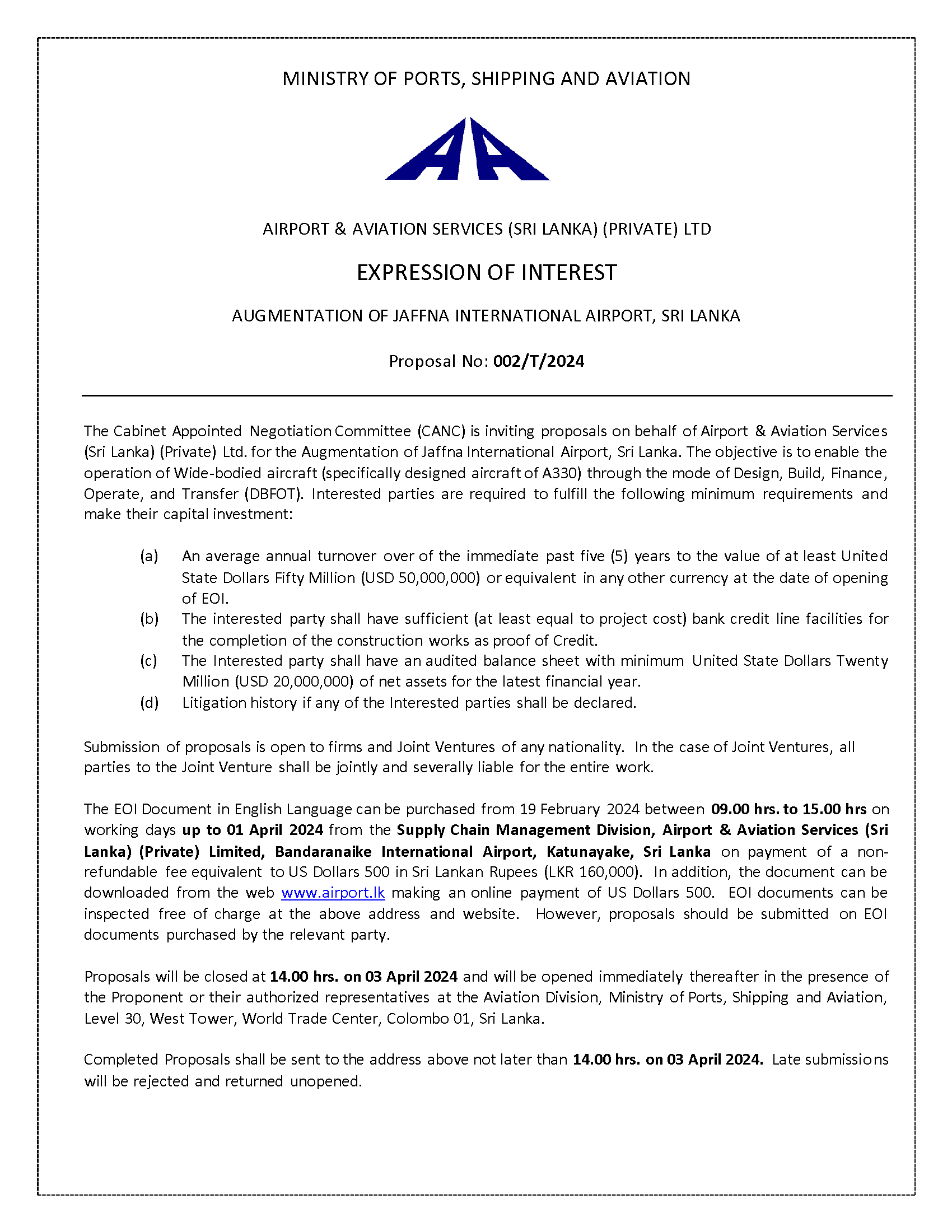 M/s Ministry of Ports, Shipping & Aviation of Sri Lanka is calling proposals on behalf of Airport & Aviation Services (Sri Lanka) (Private) Ltd. for the Augmentation of Jaffna International Airport, Sri Lanka.