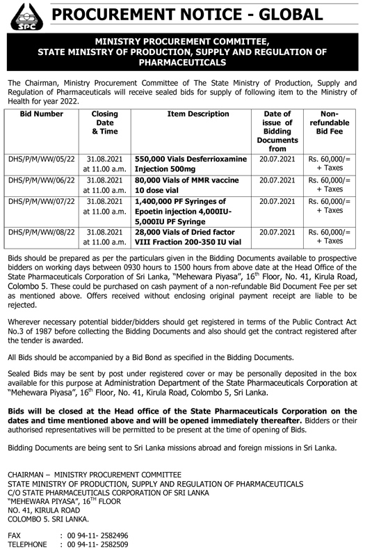 - DHS/P/M/WW/05/22 – 550,000 Vials Desferrioxamine Injection 500mg – Closing Date & Time : 31.08.2021 at 11.00am – PLEASE CLICK HERE TO SEE THE ANNEXURE