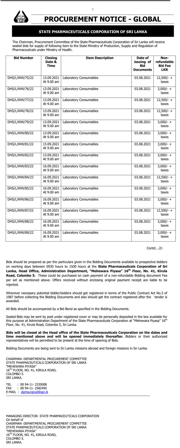 The Chairman, Procurement Committee of the State Pharmaceuticals Corporation of Sri Lanka is calling sealed bids for supply of following items to the State Ministry of Production, Supply and Regulation of Pharmaceuticals under Ministry of Health.