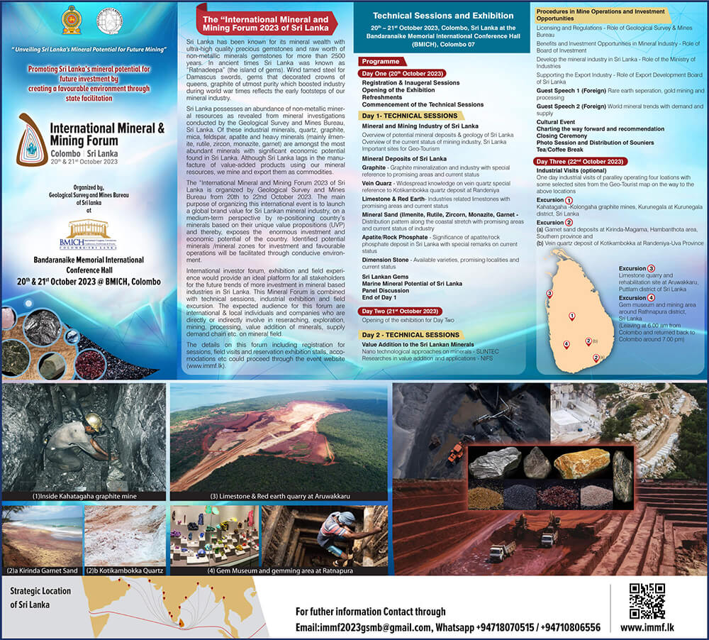 Geological survey and Mines Bureau and the Ministry of Environment will be organizing the International Mineral and Mining Forum from 20-21 October 2023 ai the BMICH in Colombo. This is being organized in collaboration with the National Gem and Jewellery Authority.