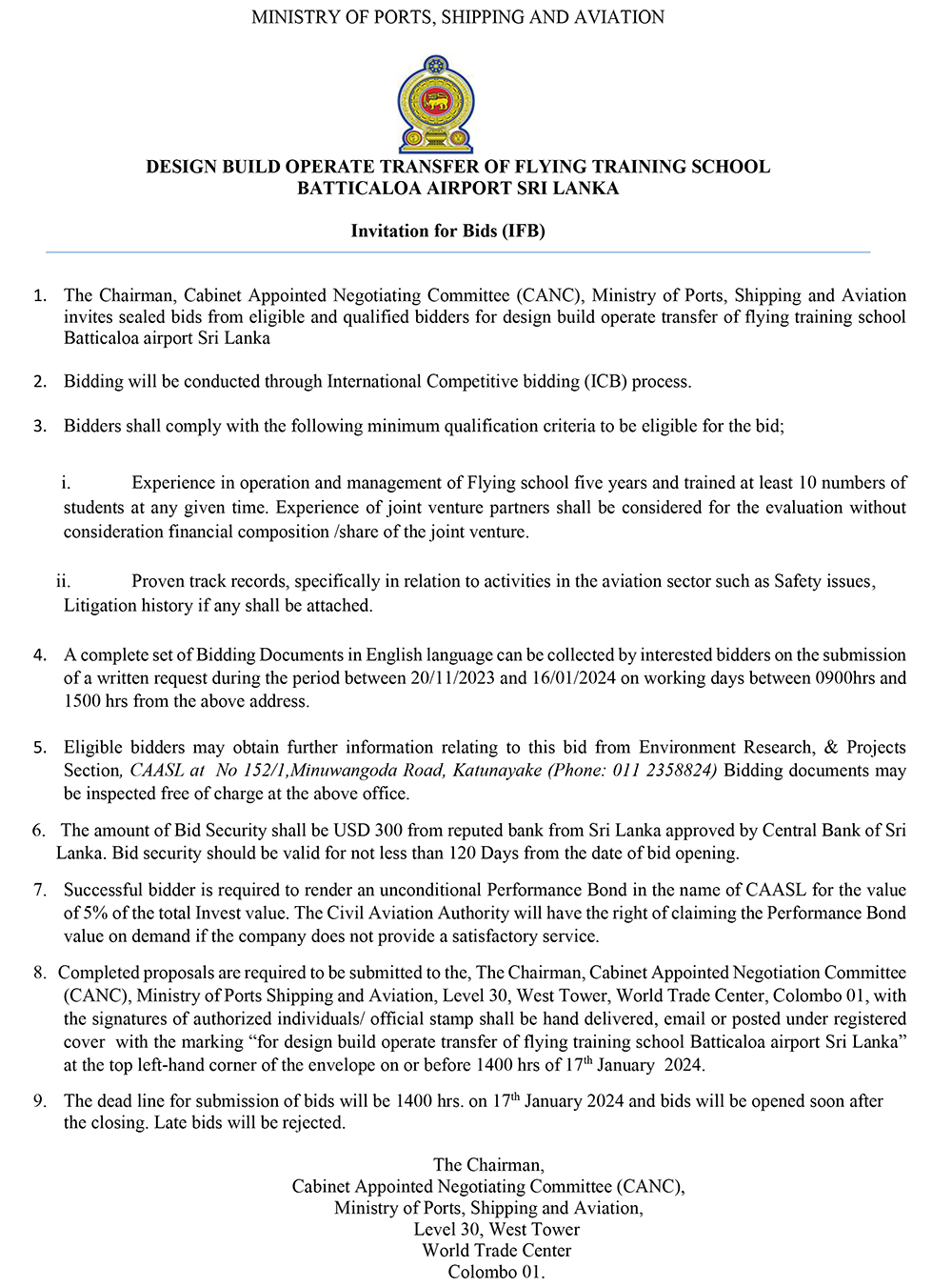 The Chairman, Cabinet Appointed Negotiating Committee (CANC), Ministry of Ports, Shipping and Aviation is calling sealed bids from eligible and qualified bidders for design build operate transfer of flying training school, Batticaloa airport, Sri Lanka