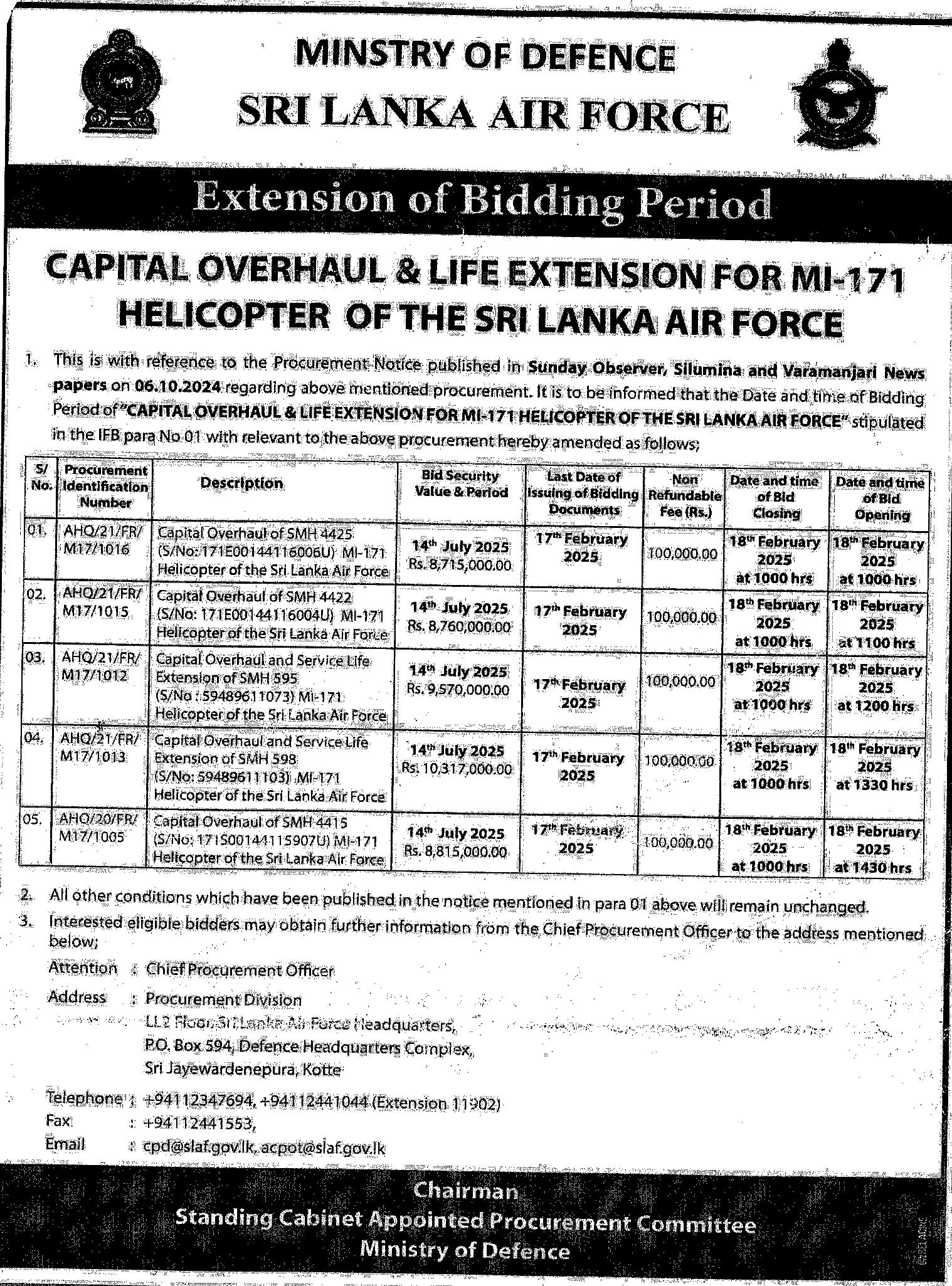 The Chairman, Standing Cabinet Appointed Procurement Committee (SCAPC), Ministry of Defence, Sri Lanka on behalf of the Secretary, Ministry of Defence, Defence Headquarters Complex, Sri Jayawardenepura, Kotte, Sri Lanka is calling bids from eligible and qualified bidders for the “Capital Overhaul & Life Extension for MI-171 Helicopter of the Sri Lanka Air Force.