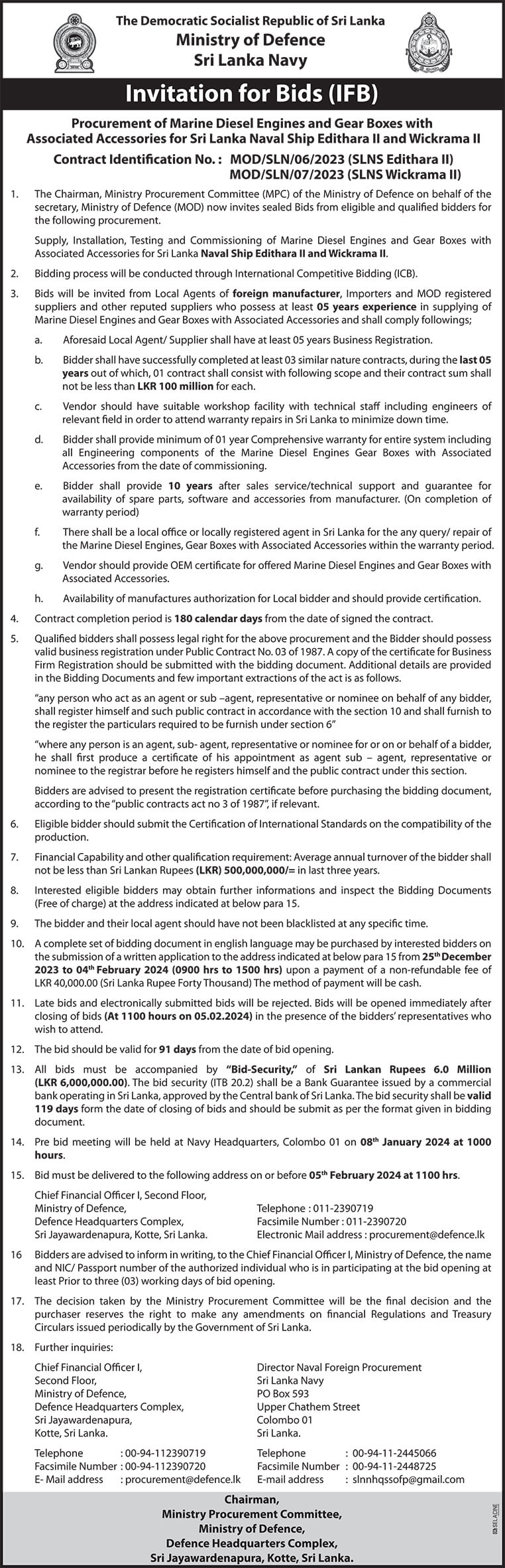 - Procurement of supply, installation, testing and commissioning of Marine Diesel Engines and Gear Boxes with Associated Accessories for Sri Lanka Naval Ship Edithara II – MOD/SLN/06/2023
