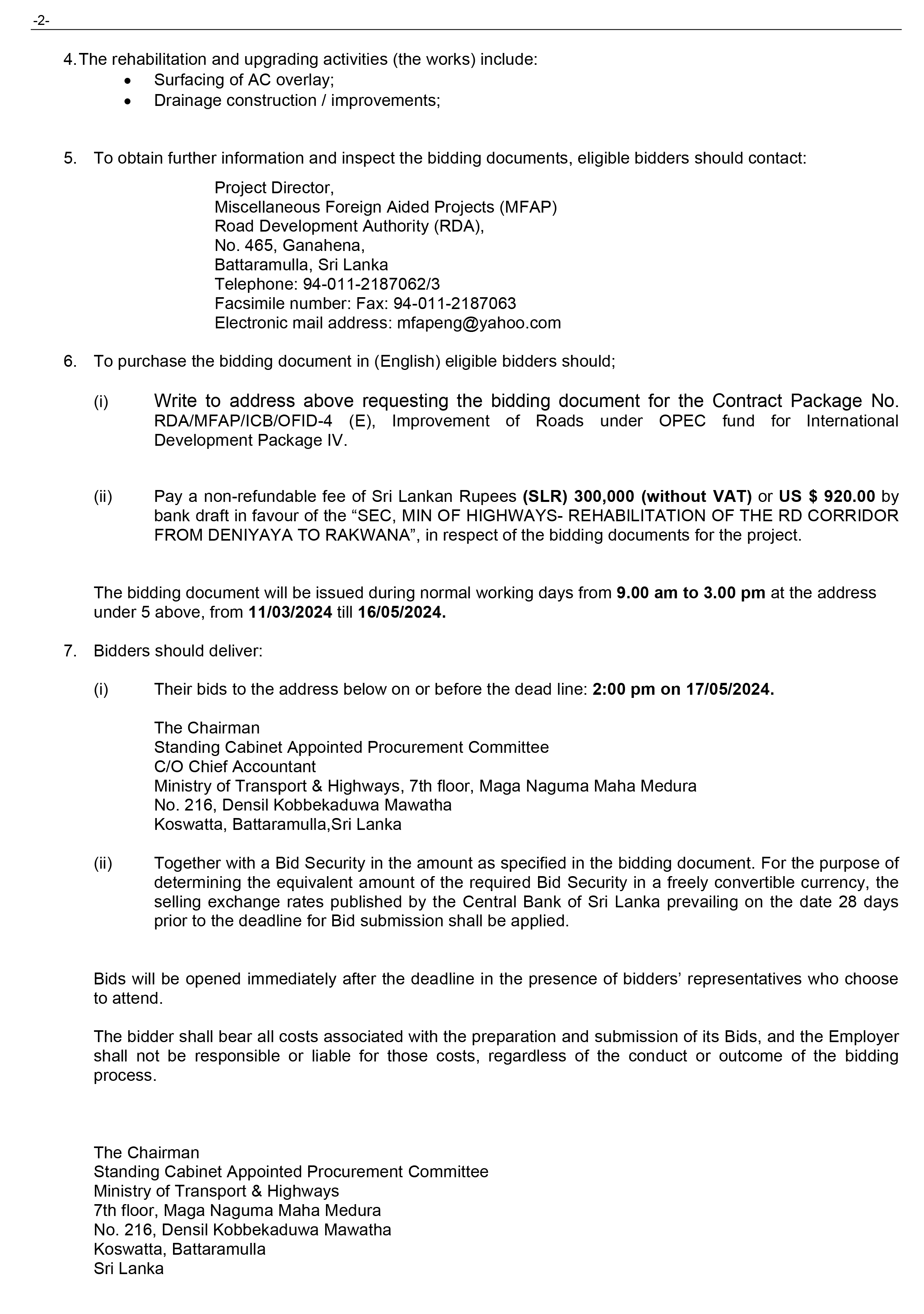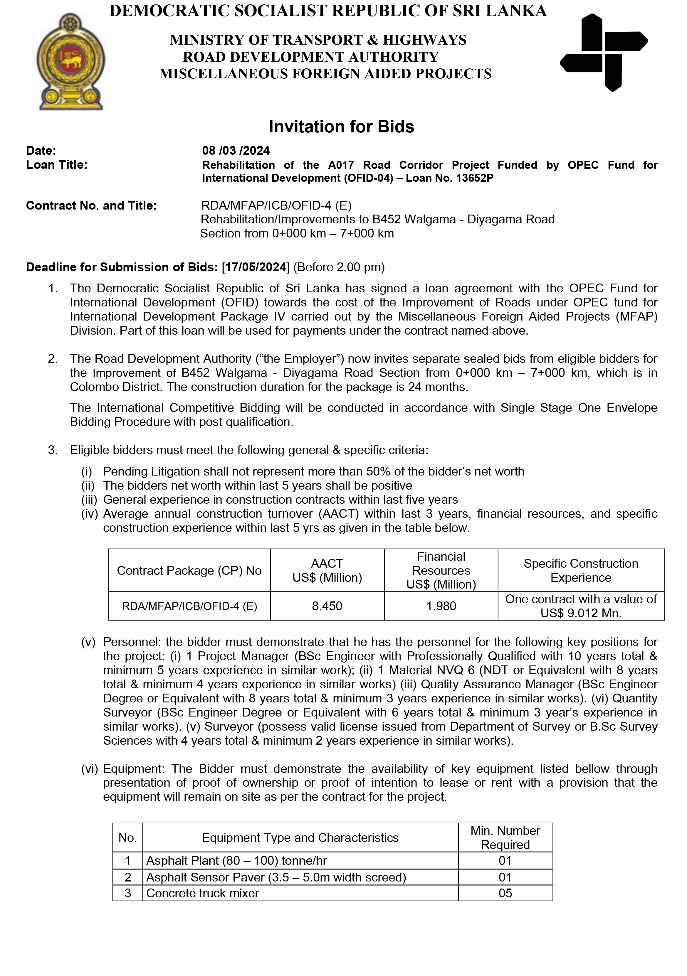 Ministry of Transport and Highways is calling bids for Rehabilitation and Improvement of (B452) Walgama – Diyagama Road Section from 0+000Km – 7+000Km.