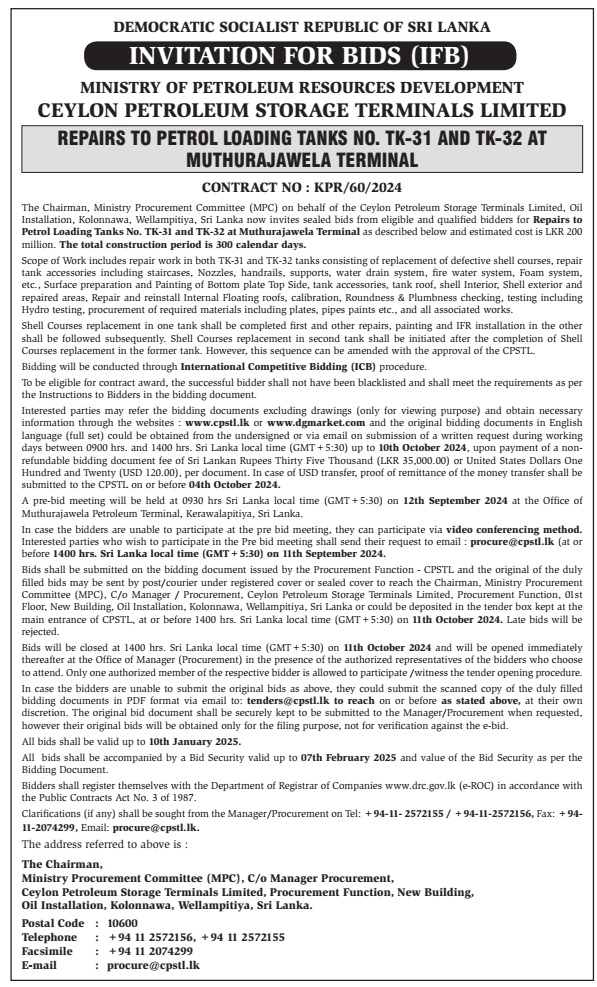 The Chairman, Ministry Procurement Committee (MPC) on behalf of the Ceylon Petroleum Storage Terminals Limited, Oil Installation, Kolonnawa, Wellampitiya, Sri Lanka is calling sealed bids from eligible and qualified bidders for “Repairs to Petrol Loading Tanks No. TK-31 and TK-32 at Muthurajawela Terminal.