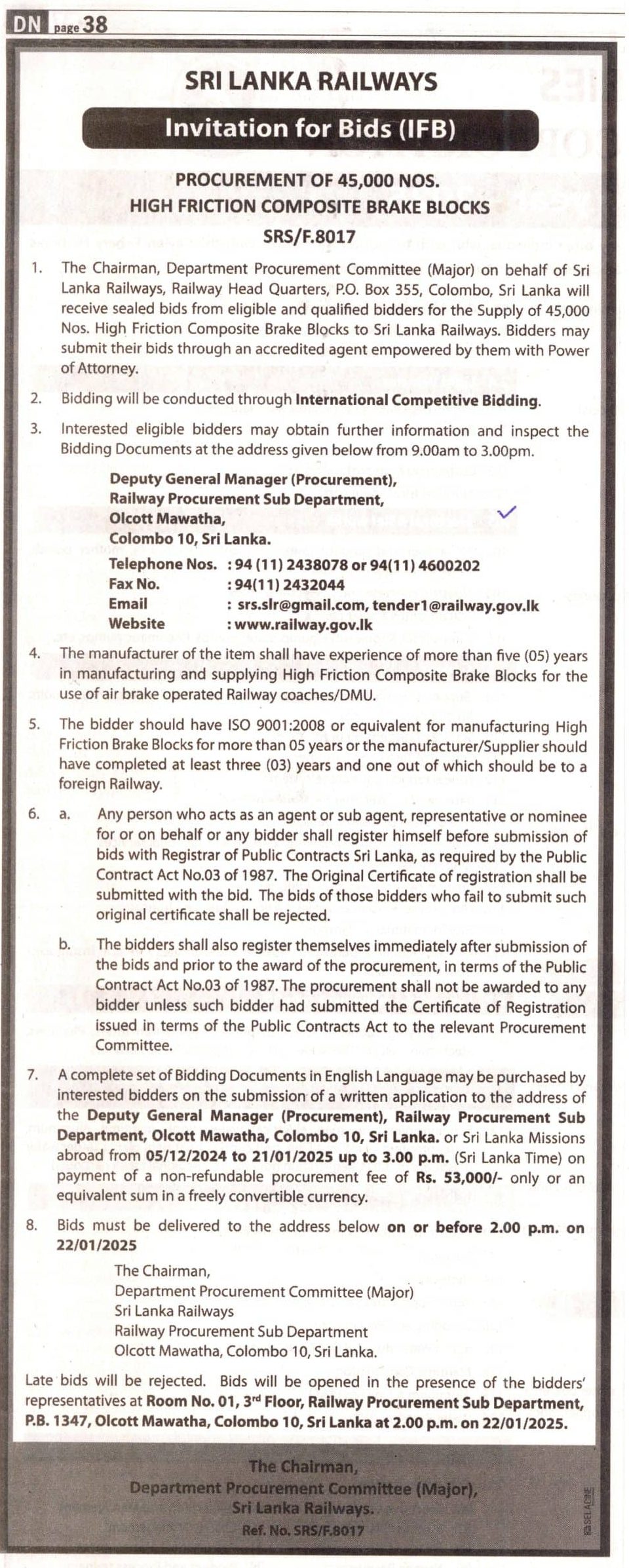 The chairman, Department procurement committee (Major), Sri Lanka Railways, Colombo, Sri Lanka is calling sealed bids from eligible and qualified bidders for the supply of 45,000 Nos. High Friction Composite Brake Blocks to Sri Lankan Railways.   [To see the Bid document (PLEASE CLICK HERE)]