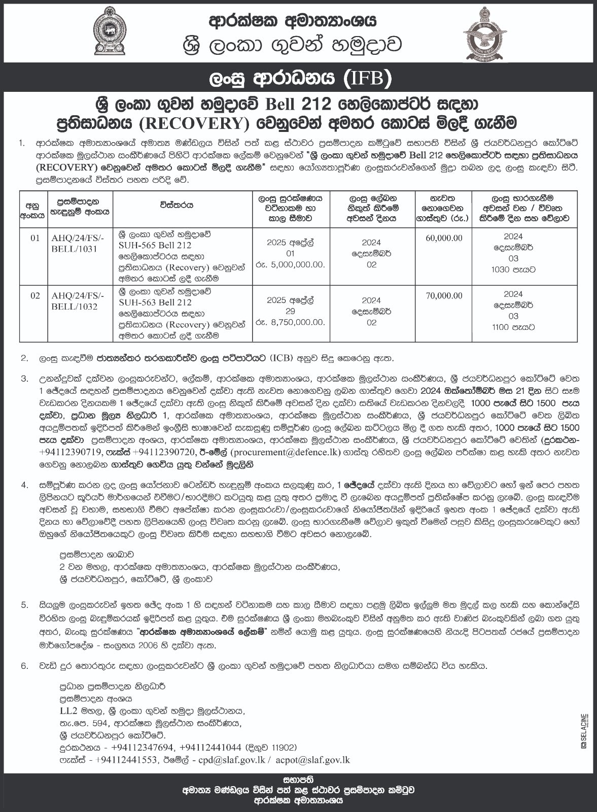The Chairman, Standing Cabinet Appointed Procurement Committee (SCAPC), Ministry of Defence, Sri Lanka on behalf of the Secretary, Ministry of Defence, Defence Headquarters Complex, Sri Jayawardanapura, Kotte, Sri Lanka is calling sealed bids from eligible and qualified bidders in Sri Lanka, or abroad for the “PURCHASE OF SPARES TO RECOVERY OF BELL 212