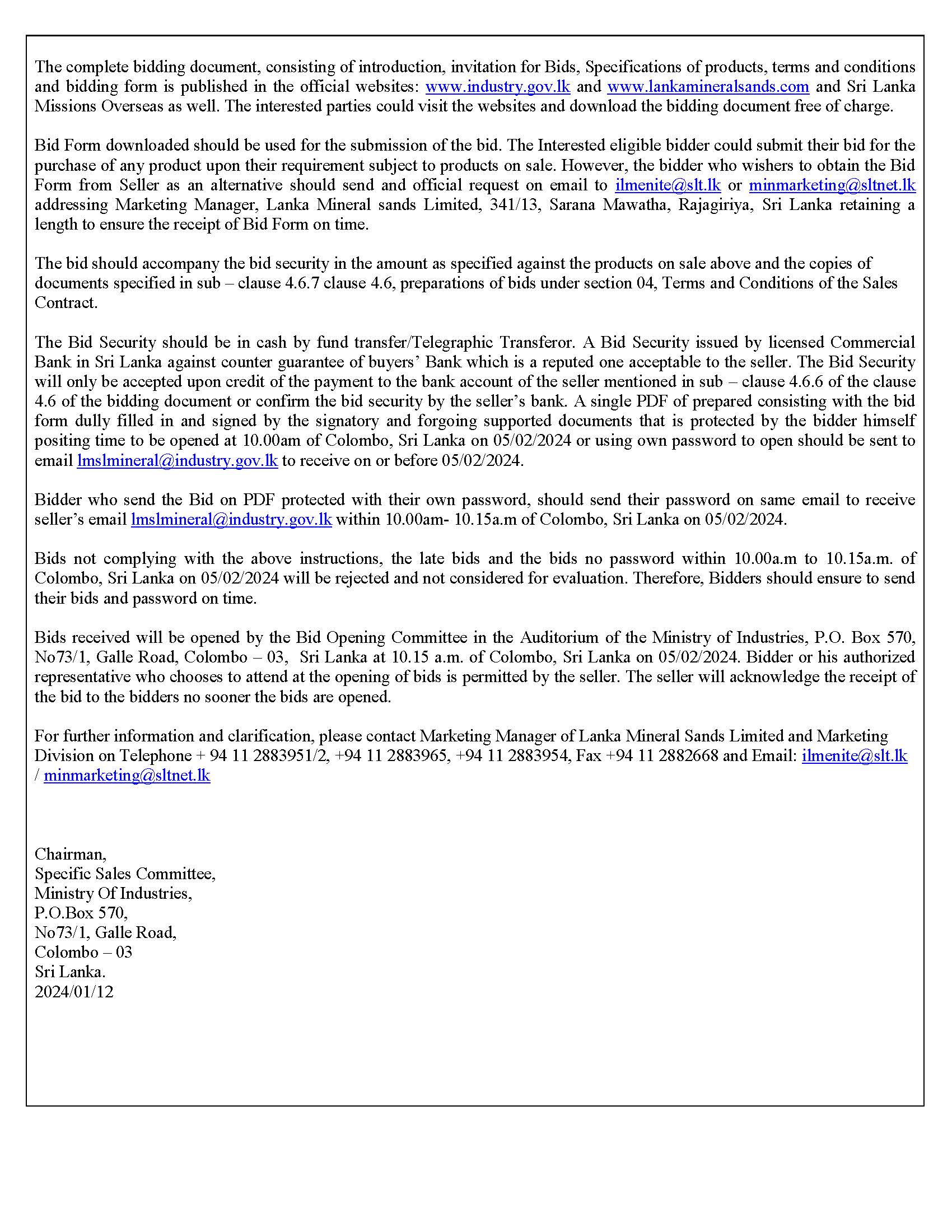 The Chairman of Specific Sales Committee, on behalf of Lanka Mineral Sands Limited is calling international bids online from the parties interested in buying the heavy mineral products produced in Sri Lanka by processing beach mineral sands.