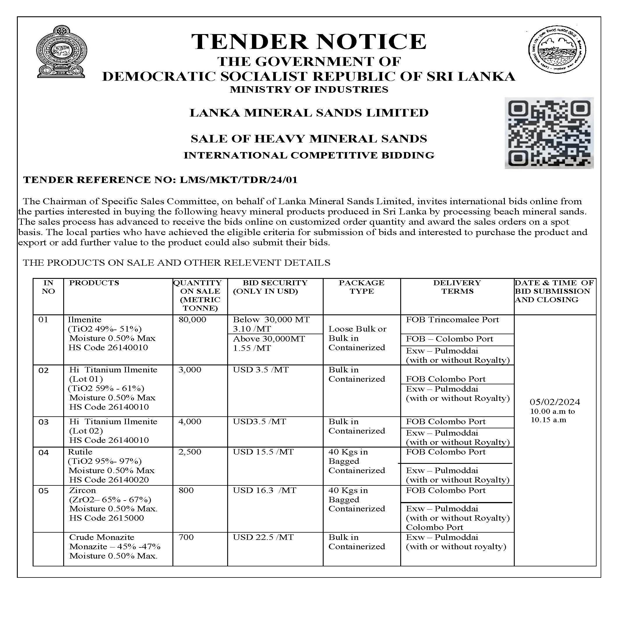 The Chairman of Specific Sales Committee, on behalf of Lanka Mineral Sands Limited is calling international bids online from the parties interested in buying the heavy mineral products produced in Sri Lanka by processing beach mineral sands.