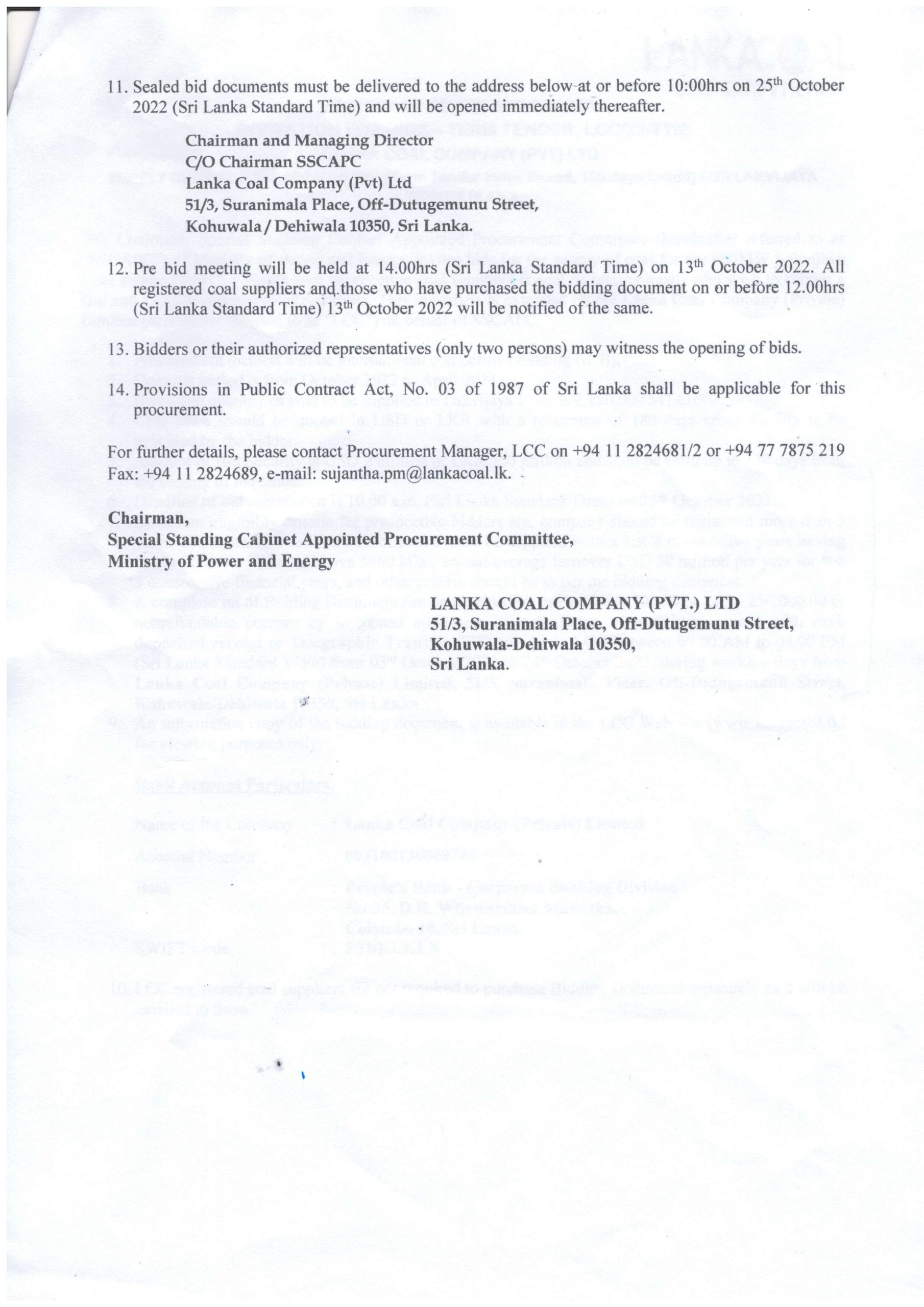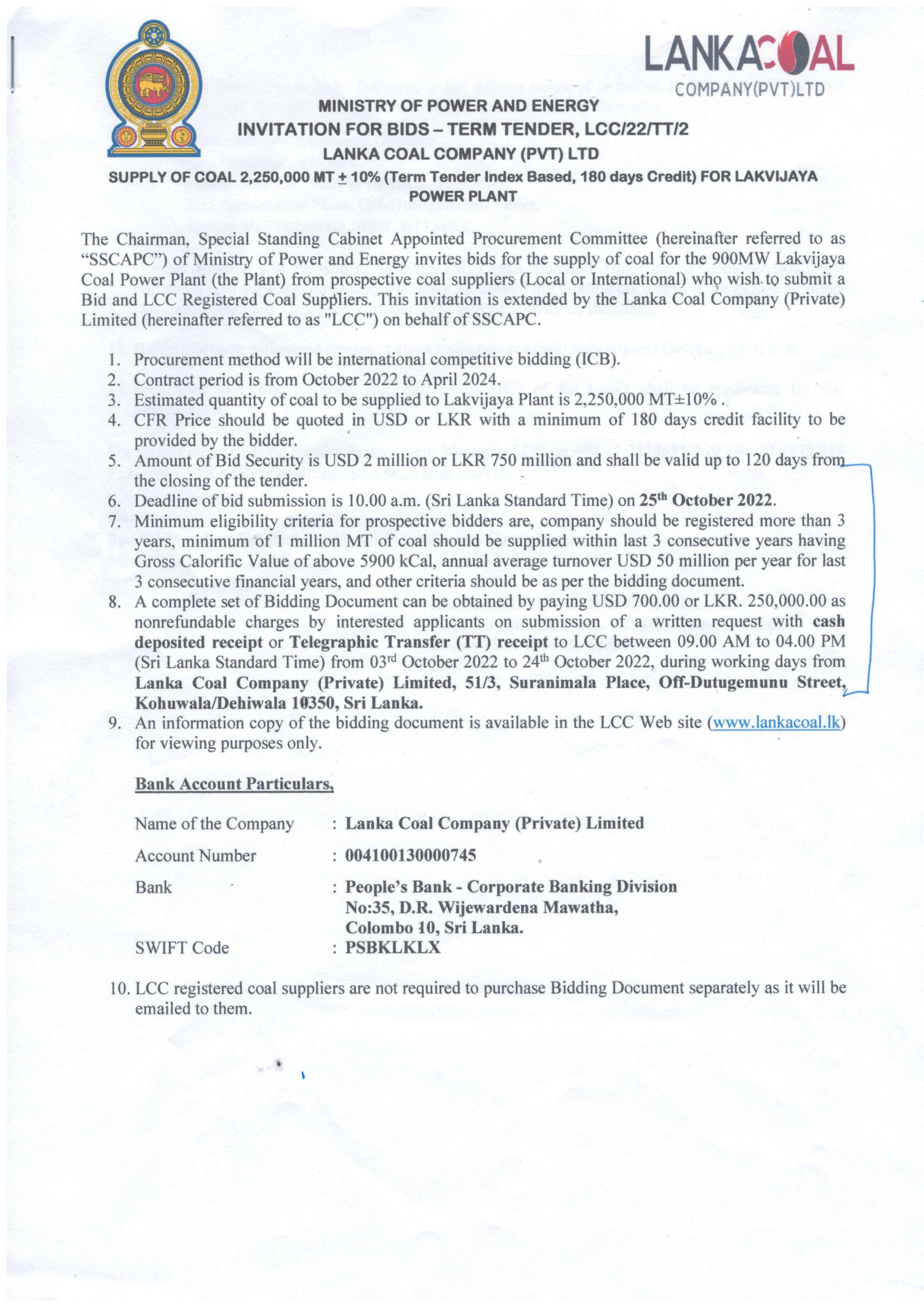 The Chairman, Special Standing Cabinet Appointed Procurement Committee of Ministry of Power and Energy calling bids for the supply of coal for the 900MW Lakvijaya Coal Power Plant from prospective coal suppliers (Local and international)