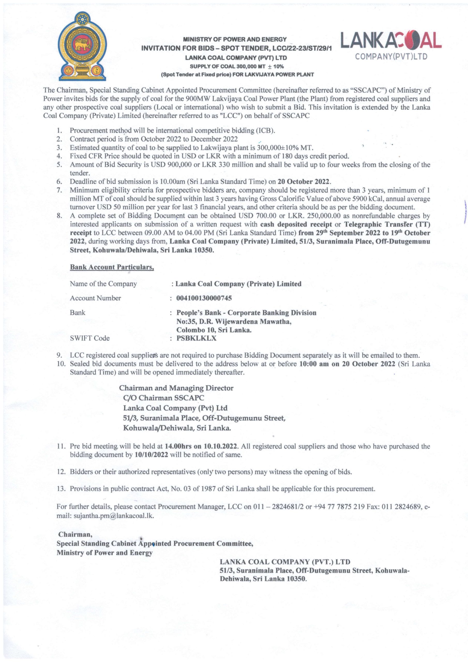 The Chairman, Special Standing Cabinet Appointed Procurement Committee of Ministry of Power calling bids for the supply of coal for the 900MW Lakvijaya Coal Power Plant from registered coal suppliers and any other prospective coal suppliers (Local and international)