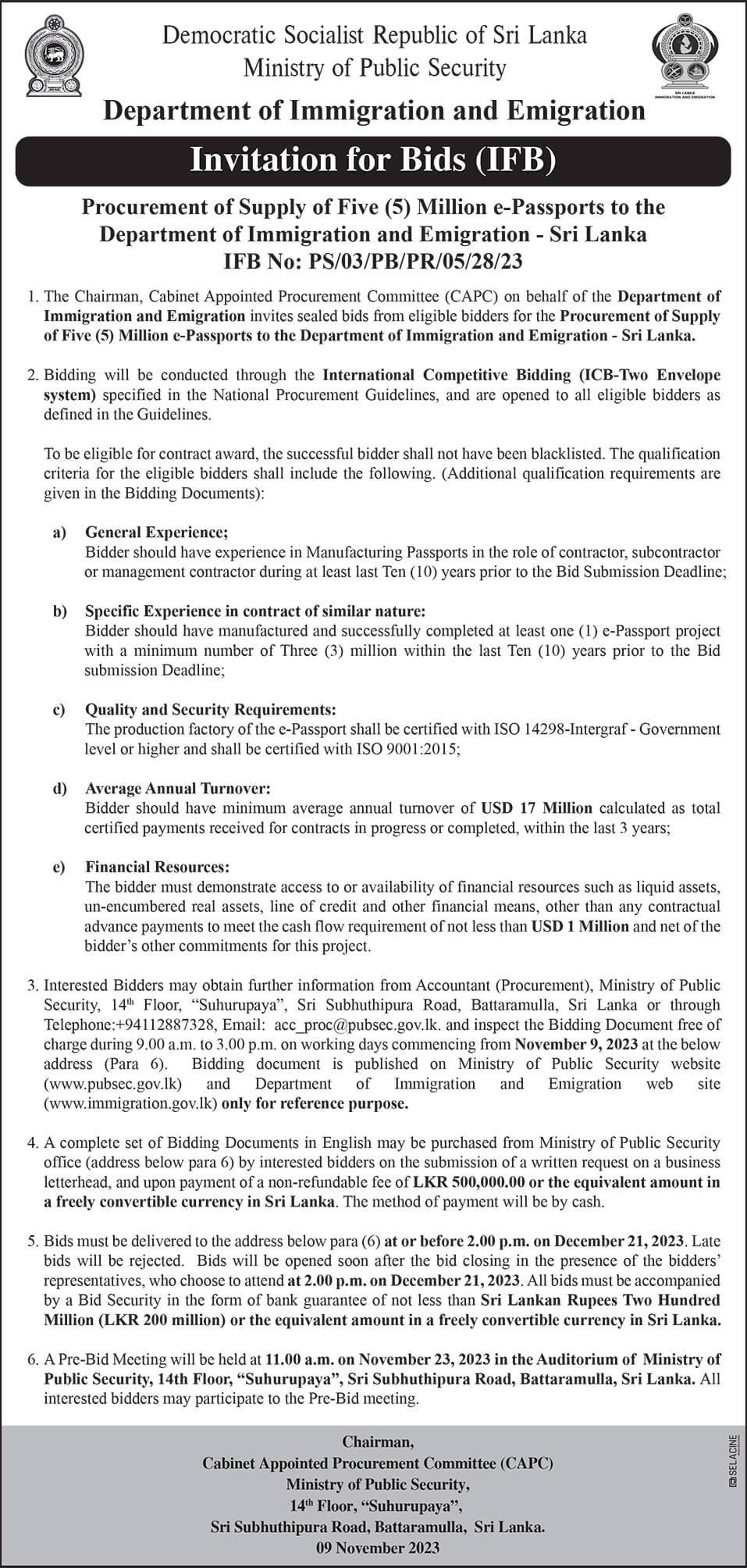 The Chairman, Cabinet Appointed Procurement Committee (CAPC) on behalf of the Department of Immigration and Emigration invites sealed bids from eligible bidders for the Procurement of Supply of Five (5) Million e-Passports to the Department of Immigration and Emigration – Sri Lanka.