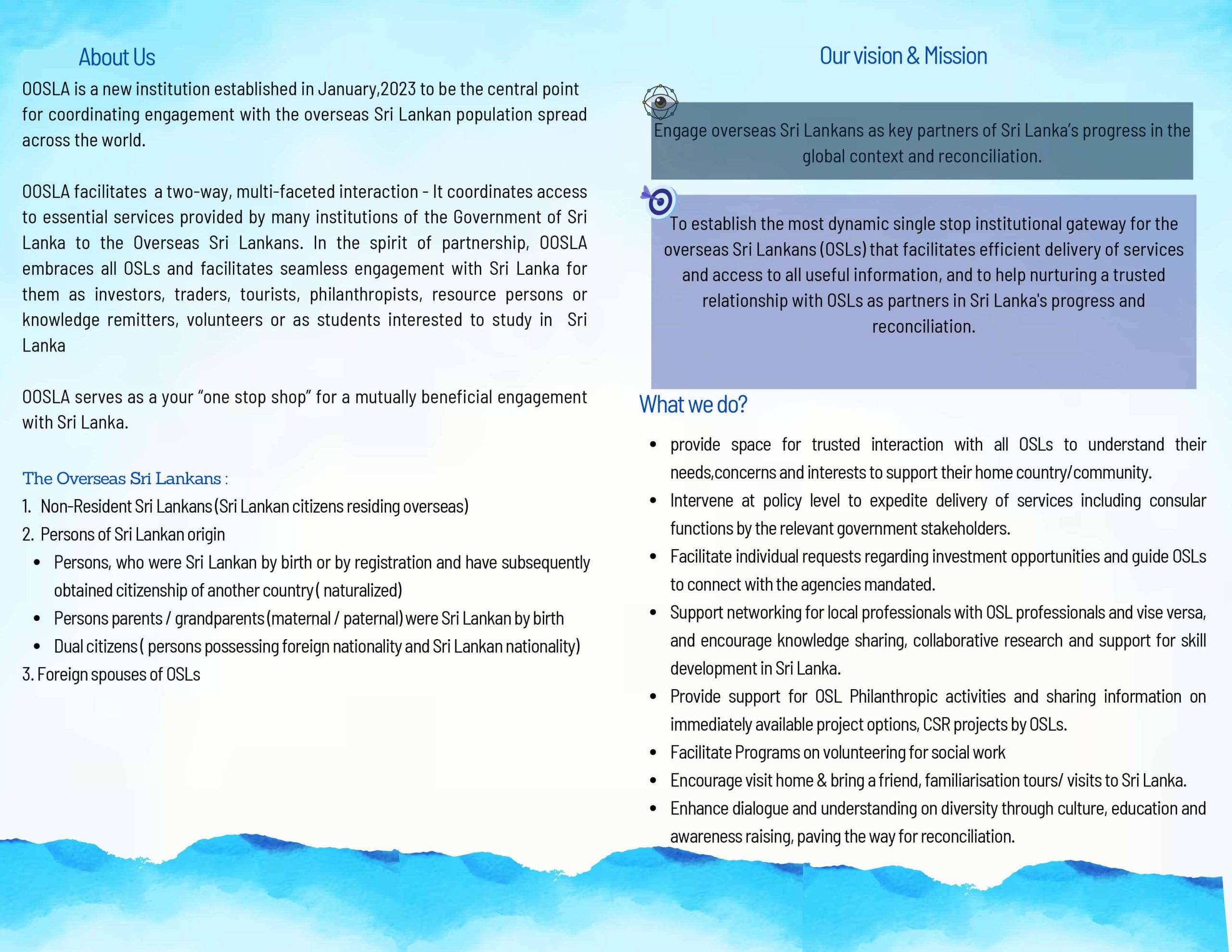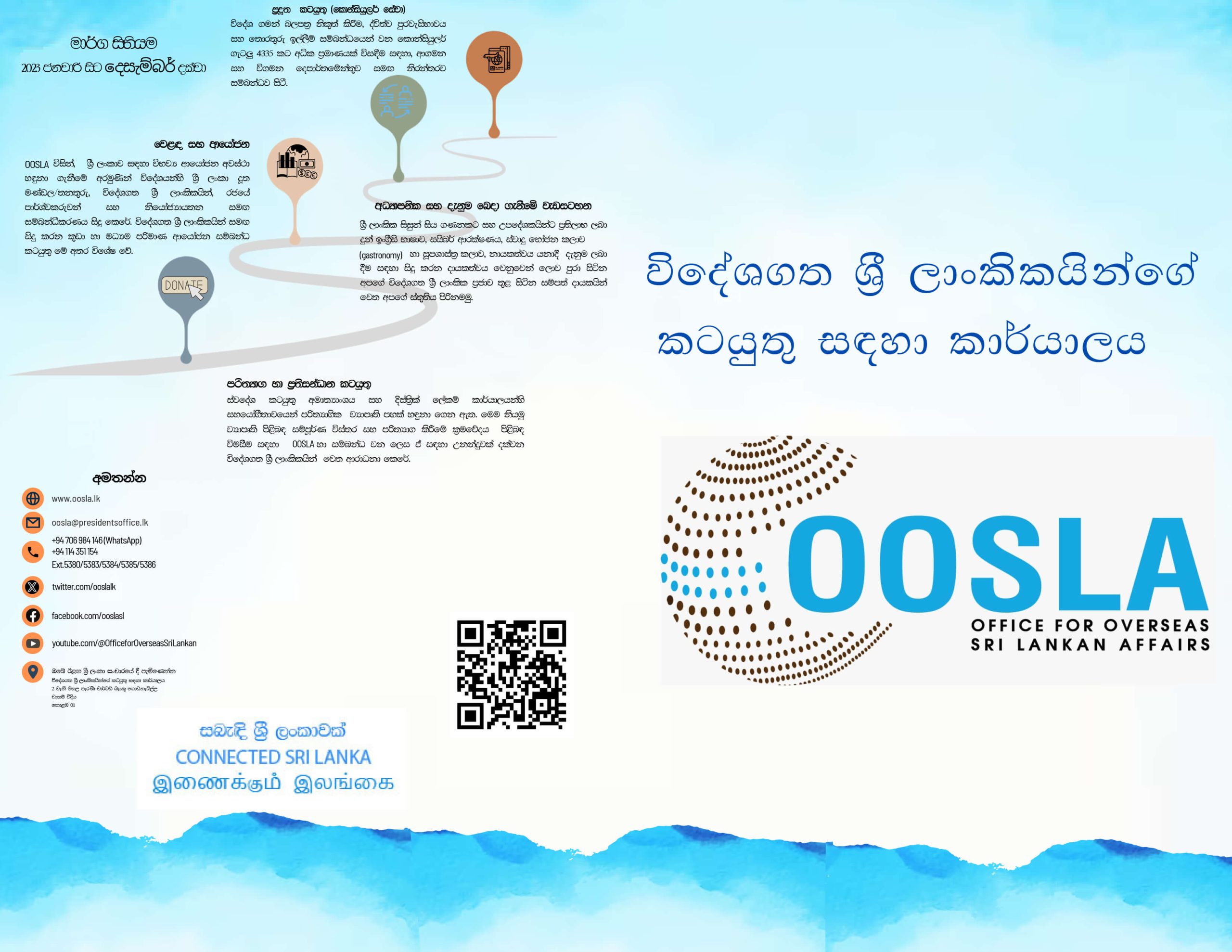 2022 interim budget proposal by his Excellency the President put to action under Cabinet Decision no. 22/2104/619/009 on December 19, 2022, the Office for Overseas Sri Lankan Affairs (OOSLA) was et up as an independent agency. OOSLA serves as the central nexus for coordination with Overseas Sri Lankans (OSLs), employing a dual strategy. Collaborating with 23 Government Stakeholders, it not only facilitates service delivery and information dissemination but also shapes policy recommendations addressing OSLs’ concerns. The primary goal is to reconnect OSLs as investors, philanthropists, and knowledge remitters, fostering a single-stop engagement platform to earn their trust. This mutually beneficial approach transcends transactional relationships, aiming to deepen understanding and dialogue among communities. By actively engaging OSLs, OOSLA envisions playing a pivotal role in building unity and reconciliation for a harmonious Sri Lanka. Please visit http://www.oosla.lk/