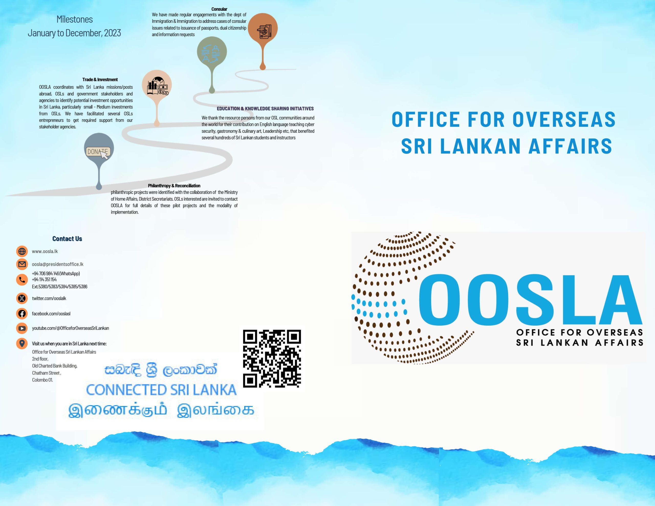 2022 interim budget proposal by his Excellency the President put to action under Cabinet Decision no. 22/2104/619/009 on December 19, 2022, the Office for Overseas Sri Lankan Affairs (OOSLA) was et up as an independent agency. OOSLA serves as the central nexus for coordination with Overseas Sri Lankans (OSLs), employing a dual strategy. Collaborating with 23 Government Stakeholders, it not only facilitates service delivery and information dissemination but also shapes policy recommendations addressing OSLs’ concerns. The primary goal is to reconnect OSLs as investors, philanthropists, and knowledge remitters, fostering a single-stop engagement platform to earn their trust. This mutually beneficial approach transcends transactional relationships, aiming to deepen understanding and dialogue among communities. By actively engaging OSLs, OOSLA envisions playing a pivotal role in building unity and reconciliation for a harmonious Sri Lanka. Please visit http://www.oosla.lk/