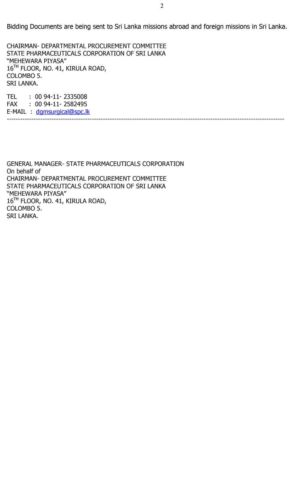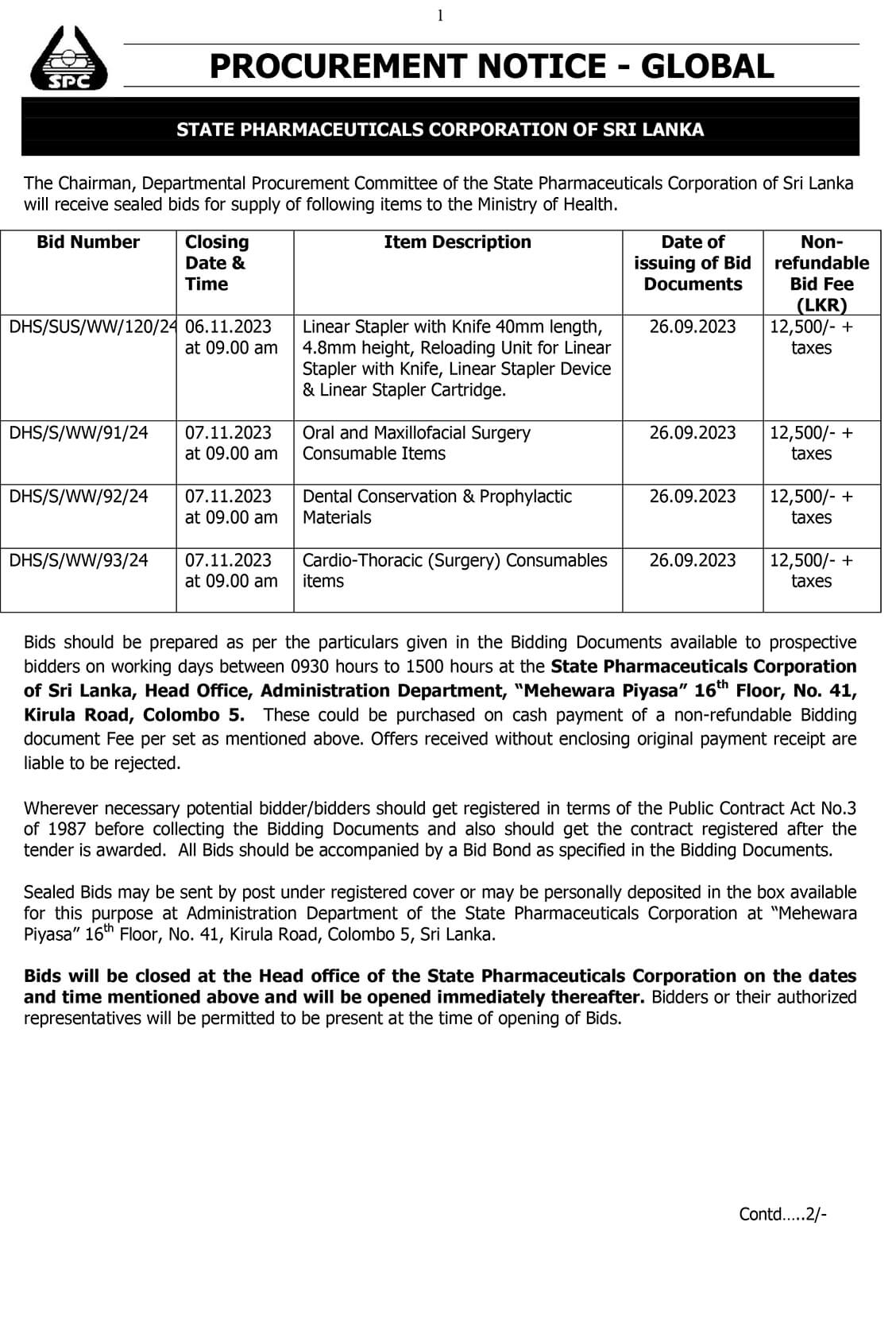 The Chairman, Departmental Procurement Committee of the State Pharmaceuticals Corporation of Sri Lanka calling sealed bids for supply of following items to the Ministry of Health.