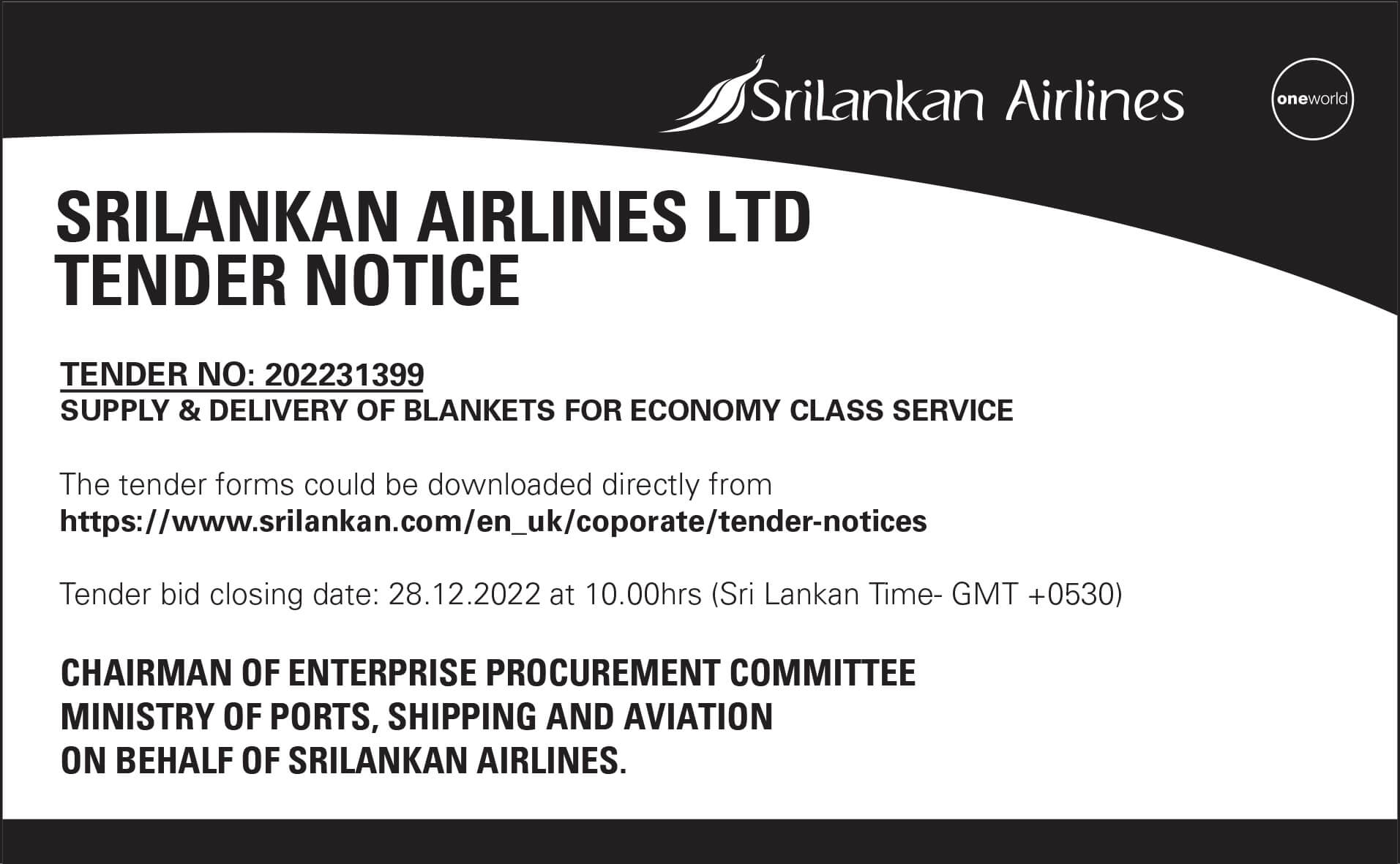 M/s SriLankan Airlines Ltd is calling bids for the for the supply of Blankets for Economy Class Service. (To see the Document PLEASE CLICK HERE)