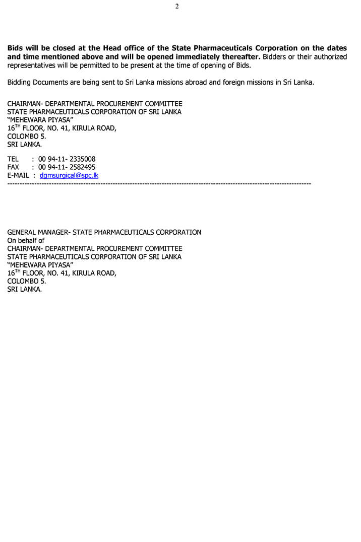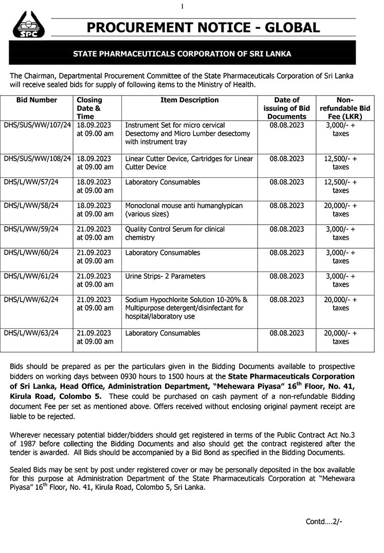 The Chairman, Departmental Procurement Committee of the State Pharmaceuticals Corporation of Sri Lanka calling sealed bids for supply of following items to the Ministry of Health.