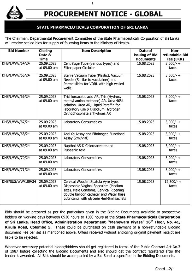 The Chairman, Departmental Procurement Committee of the State Pharmaceuticals Corporation of Sri Lanka calling sealed bids for supply of following items to the Ministry of Health.