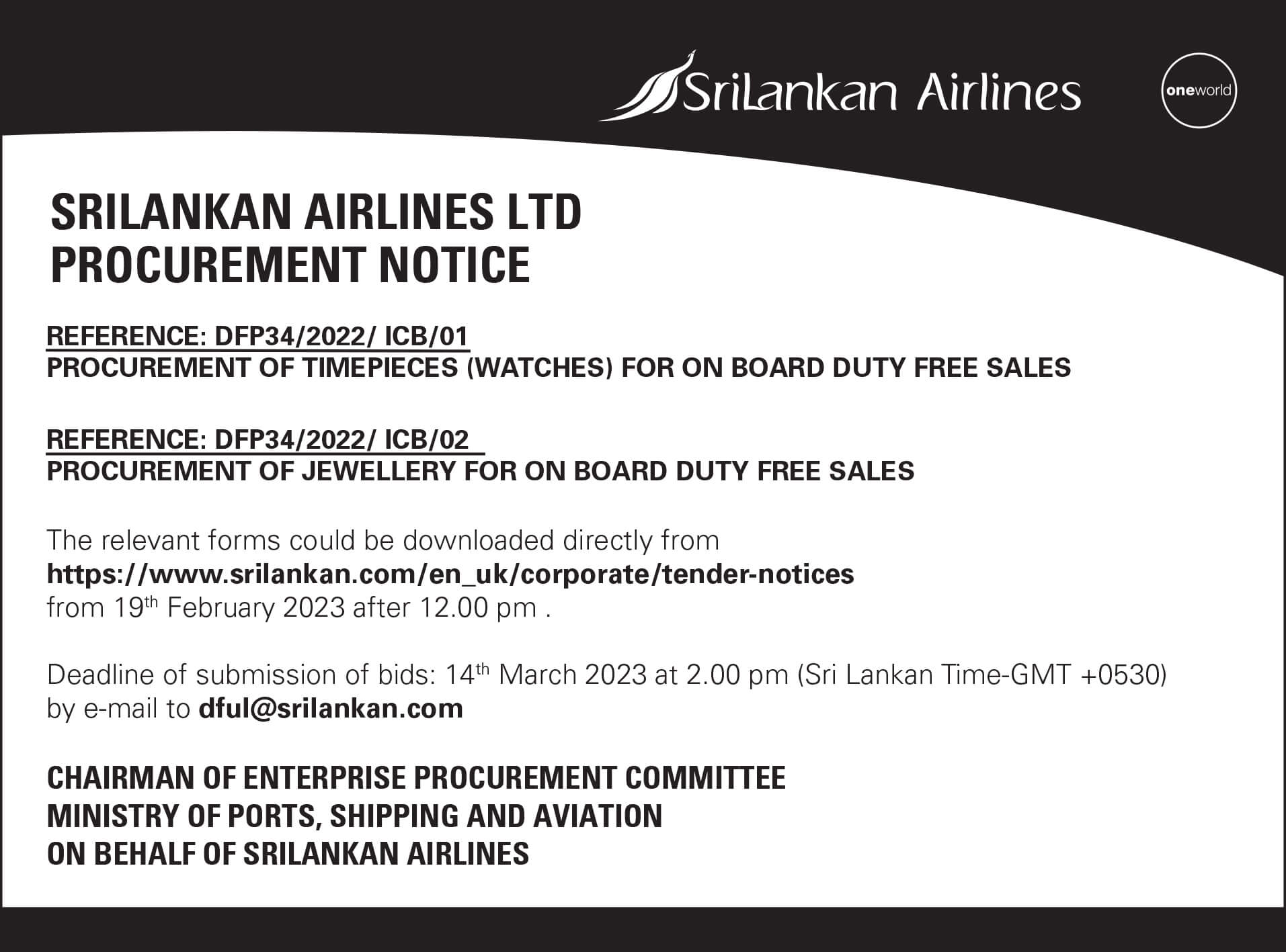 M/s SriLankan Airlines Ltd is calling bids for Timepieces (Watches) and Jewellery for on board duty free sales.