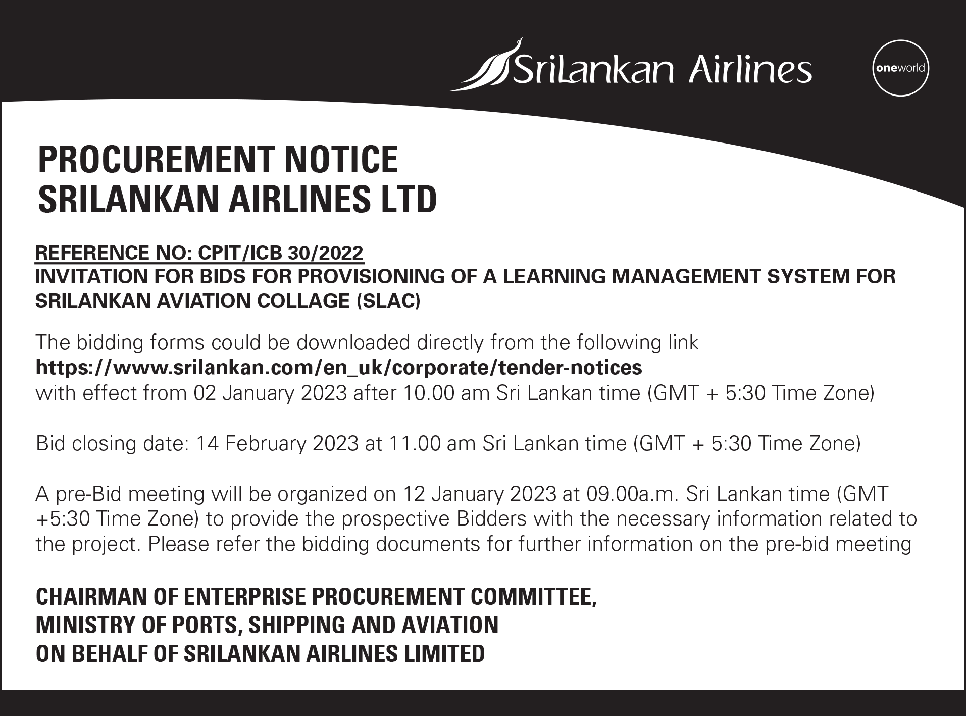 M/s SriLankan Airlines Ltd is calling bids for  provisioning of a Learning Management system for SriLankan Aviation College (SLAC).