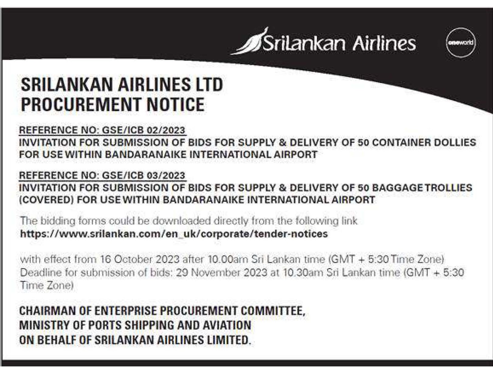 M/s SriLankan Airlines Ltd is calling bids for supply and delivery of 50 container Dollies and 50 Baggage Trollies (Covered) for use within Bandaranaike International Airport.