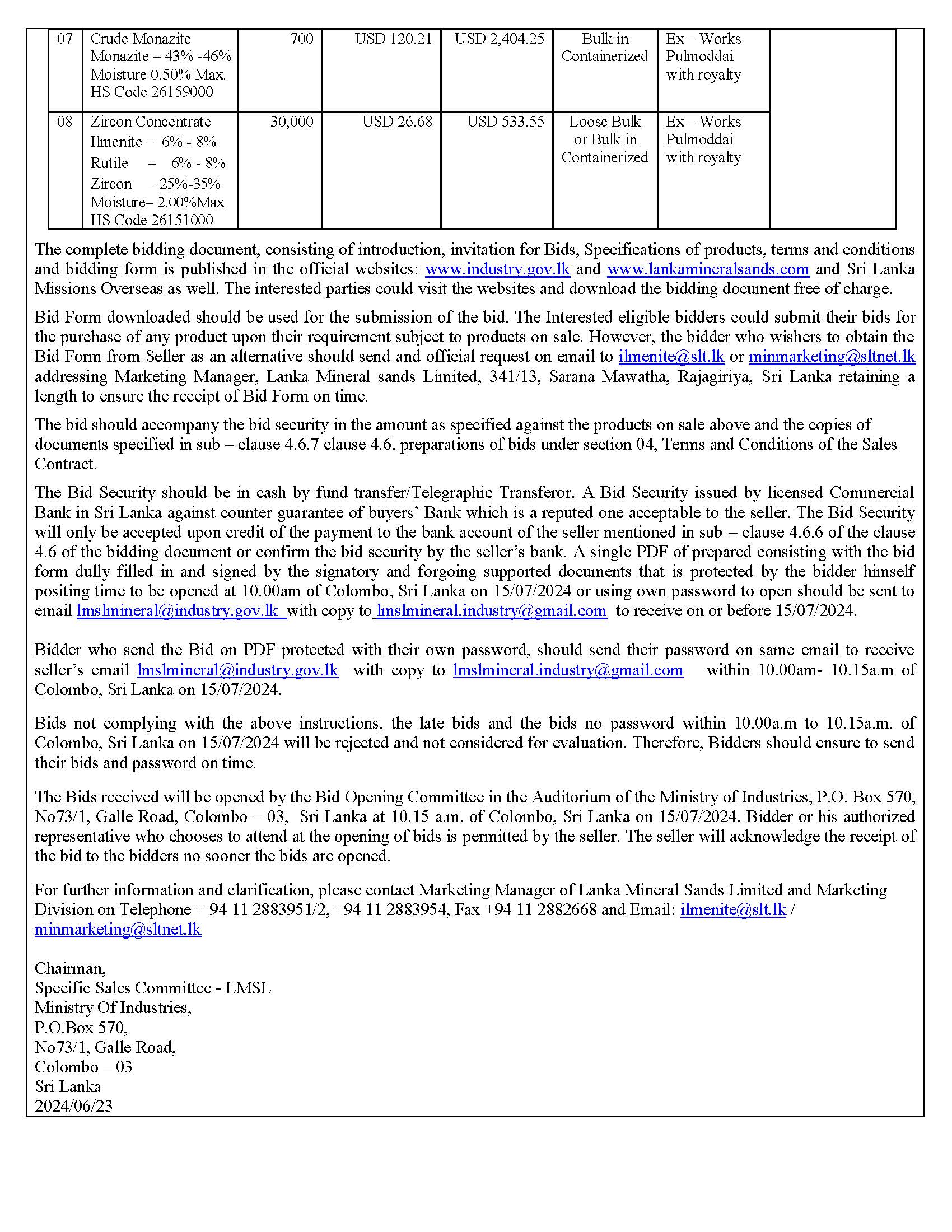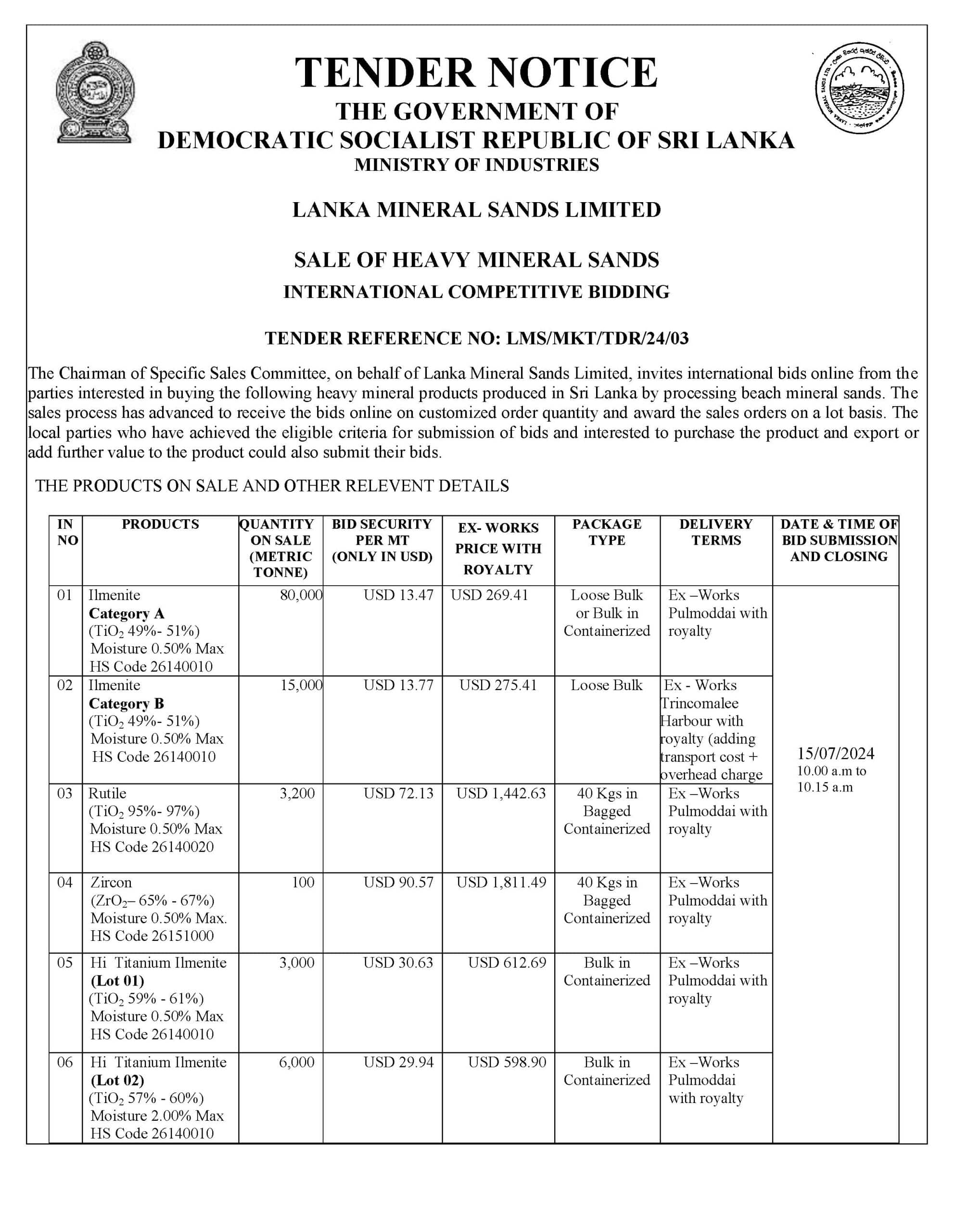 The Chairman of Specific Sales Committee, on behalf of Lanka Mineral Sands Limited is calling international bids online from the parties interested in buying the heavy mineral products produced in Sri Lanka by processing beach mineral sands. (To see the Document PLEASE CLICK HERE)