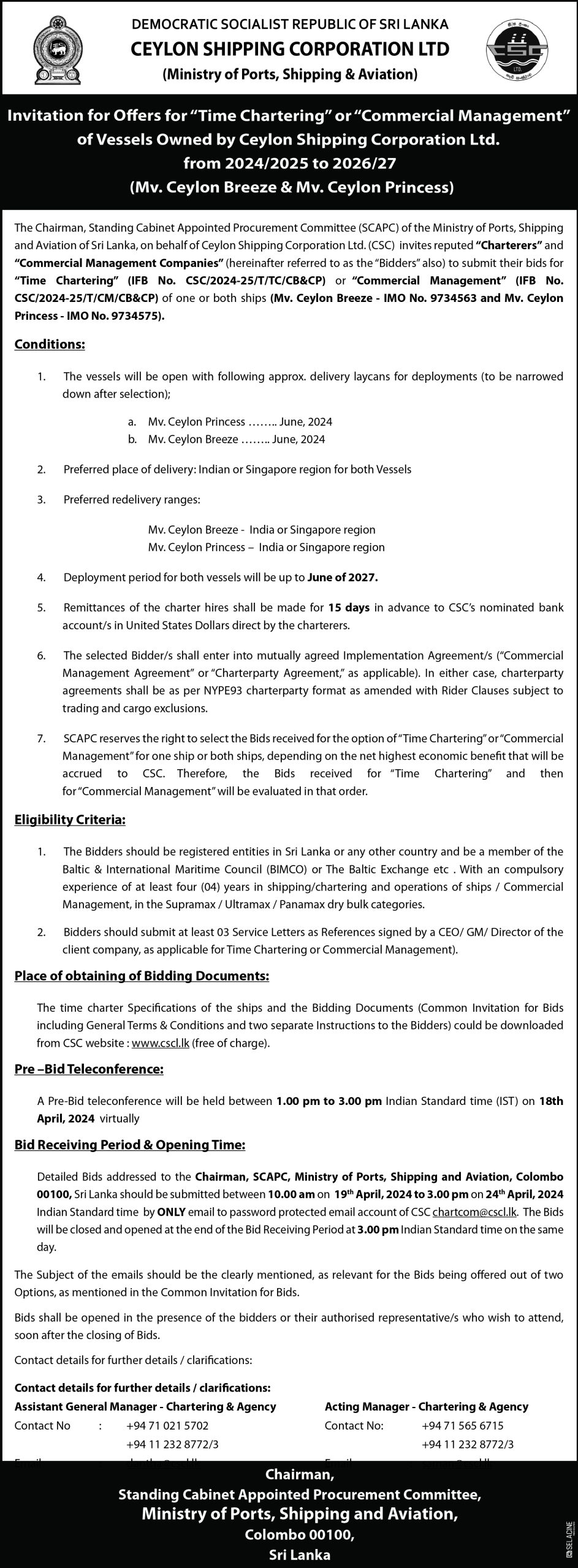 Invitation for offers for “Time Chartering” or “Commercial Management” of Vessels Owned by Ceylon Shipping Corporation Ltd. – from 2024/2025 to 2026/2027 (Mv. Ceylon Princess)