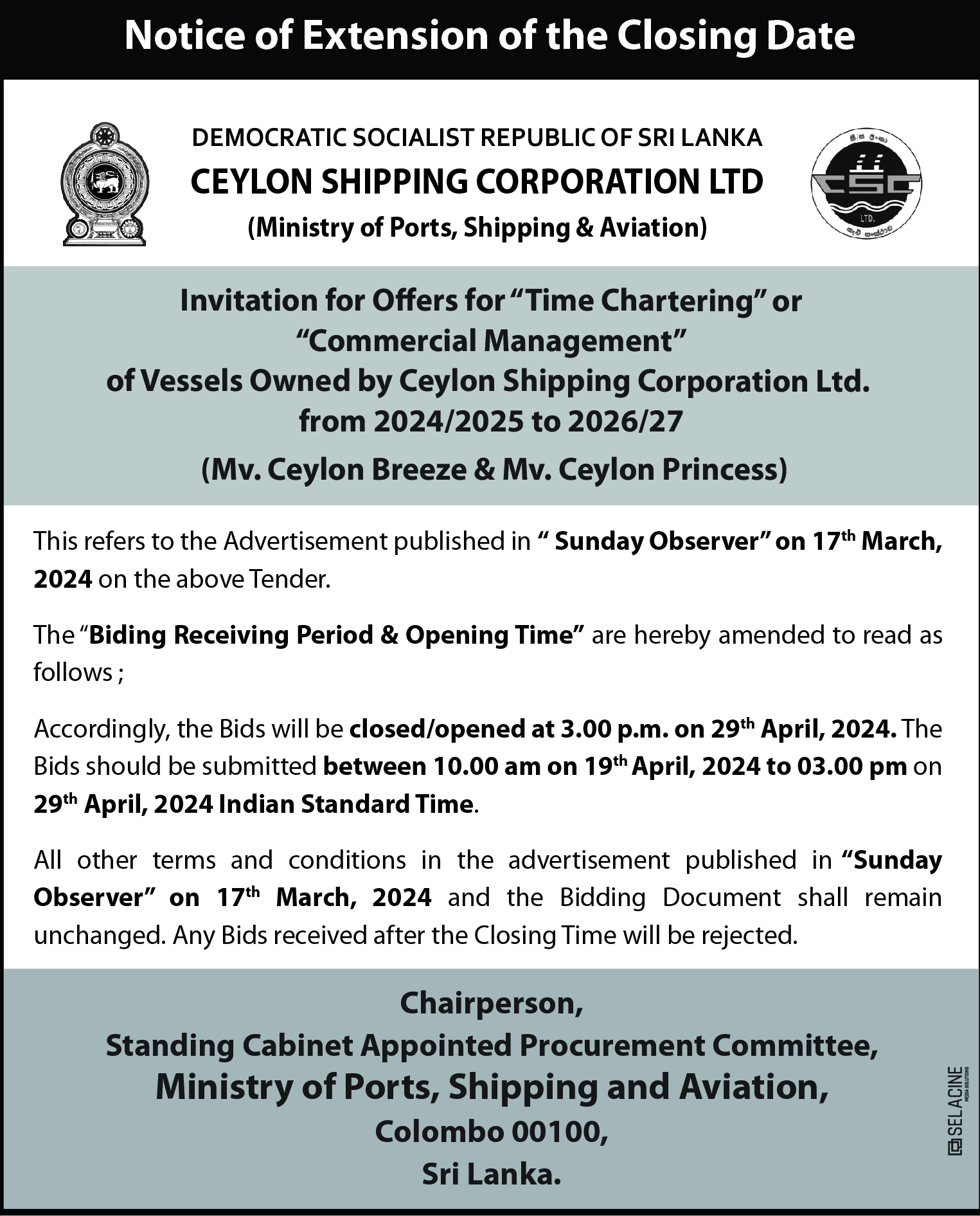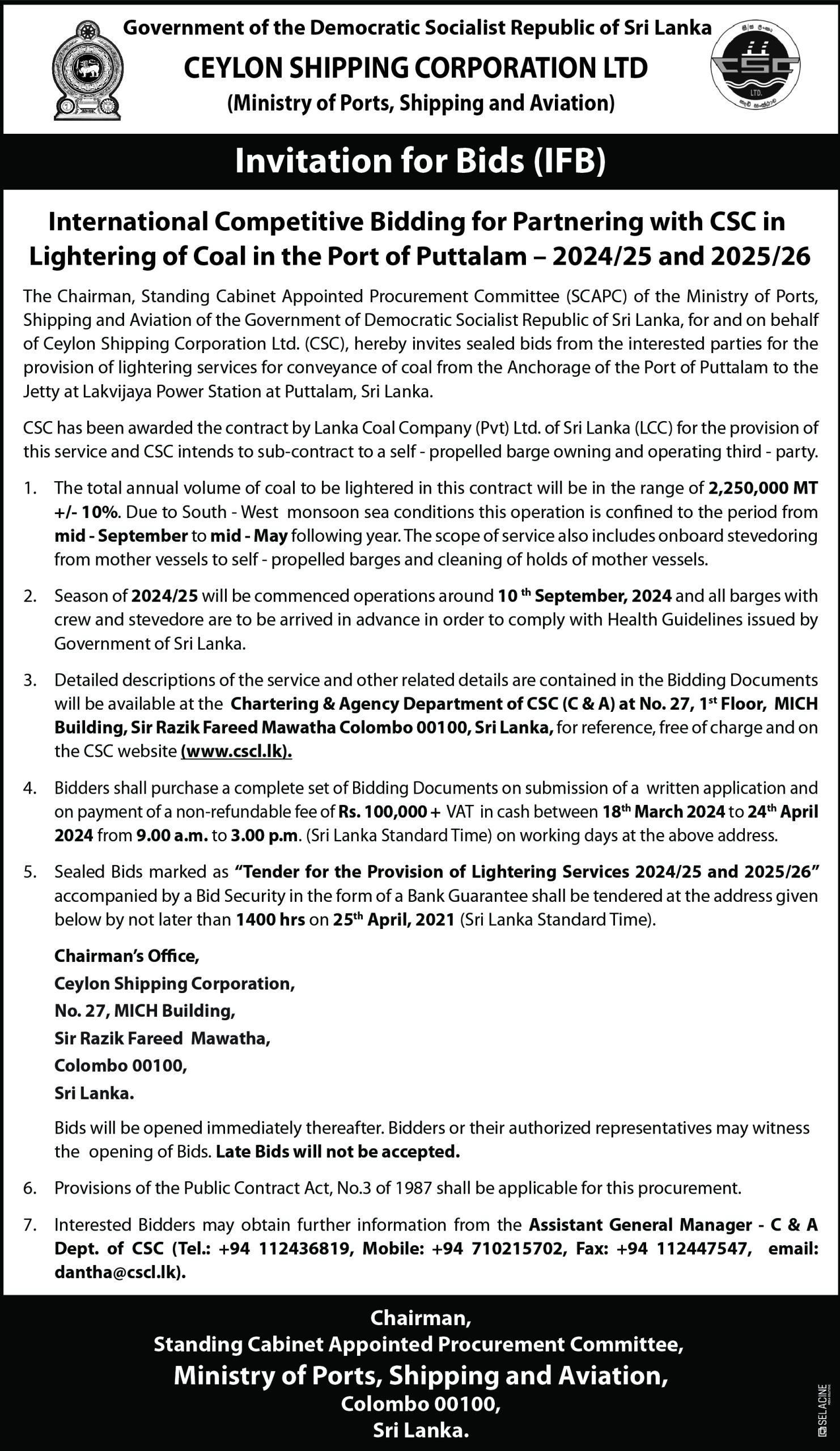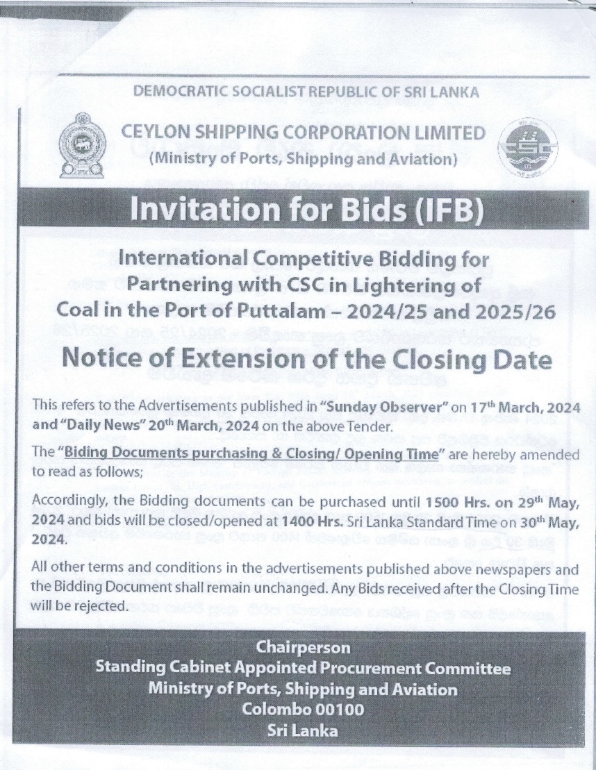 The Chairman, Standing Cabinet Appointed Procurement Committee (SCAPC) of the Ministry of Ports, Shipping and Aviation for and on behalf of the Ceylon Shipping Corporation Ltd is calling sealed bids for the followings;