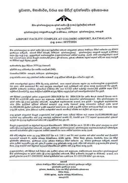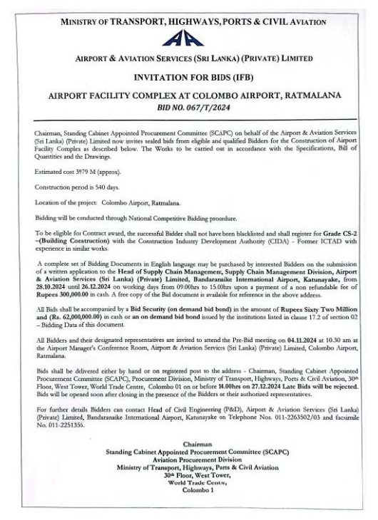 The Chairman, Standing Cabinet Appointed Procurement Committee (SCAPC) on behalf of the Airport and Aviation Services (Sri Lanka) (Private) Limited is calling sealed bids from the eligible and qualified bidders for the construction of Airport Facility Complex.