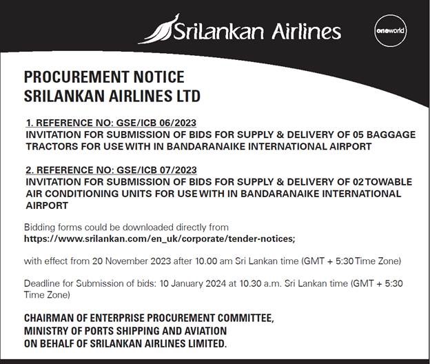 M/s SriLankan Airlines Ltd is calling bids for supply and delivery of 05 baggage tractors and 02 towable air conditioning units for use with in Bandaranaike International Airport.