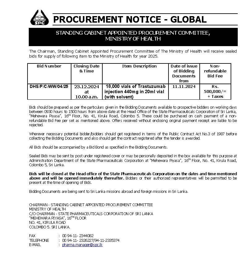M/s State Pharmaceuticals Corporation of Sri Lanka is calling sealed bid for supply of surgical items.