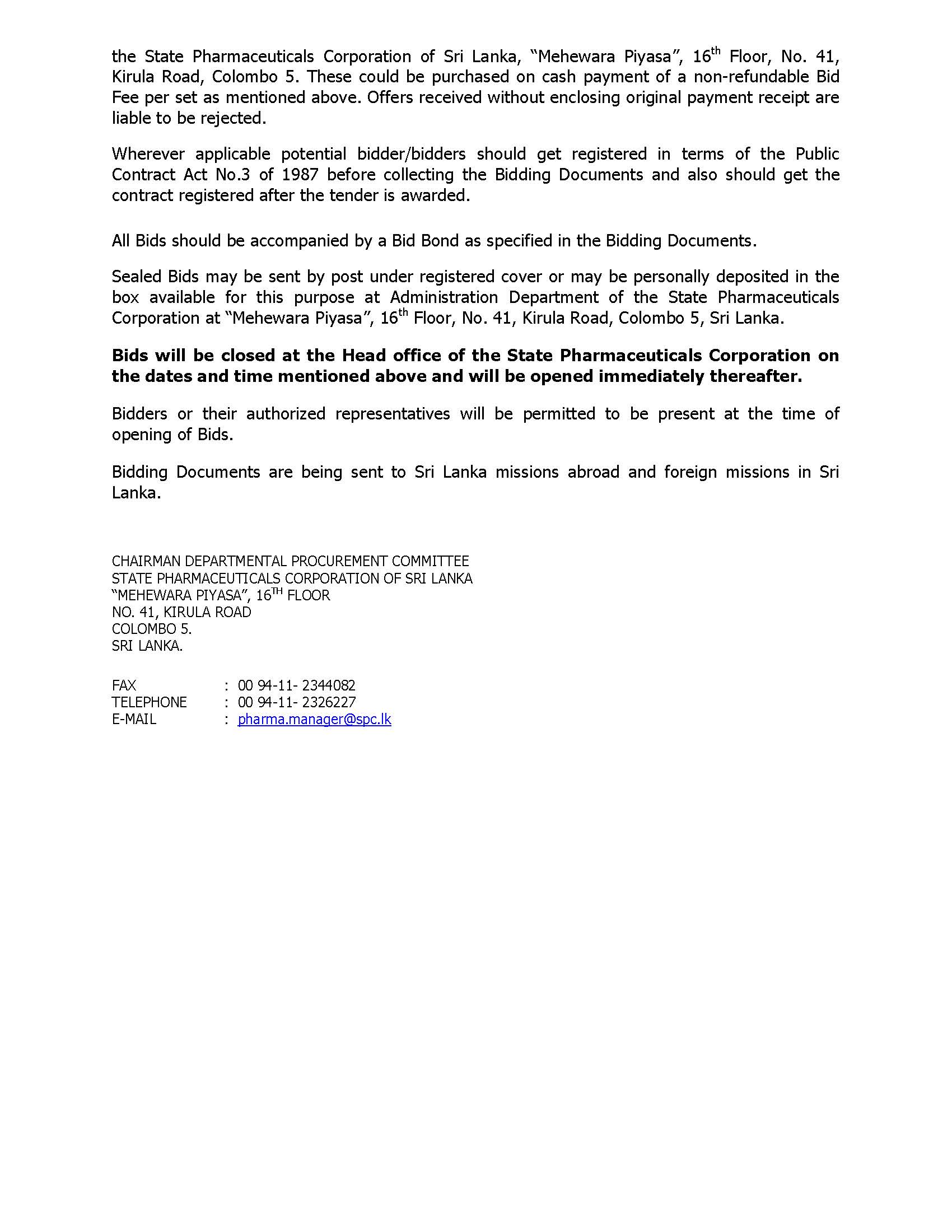 The Chairman, Procurement Committee of the State Pharmaceuticals Corporation of Sri Lanka is calling sealed bids for supply of following items to the Department of Health Services, Sri Lanka for the year 2024-2025.