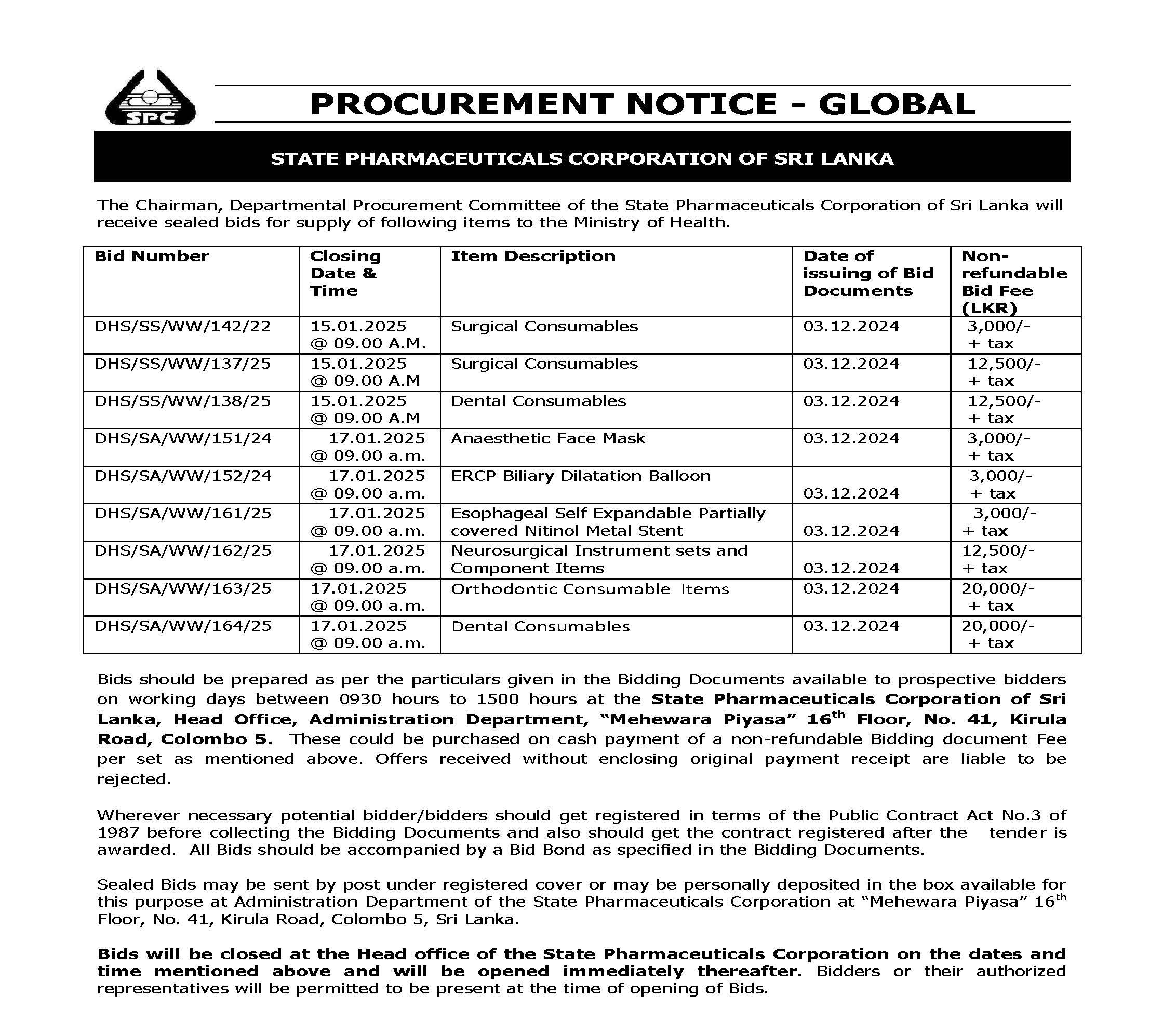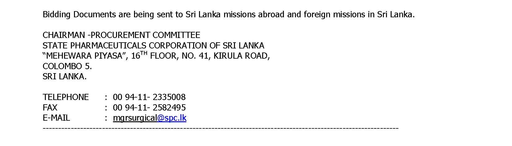The Chairman, Departmental Procurement Committee of the State Pharmaceuticals Corporation of Sri Lanka is calling sealed bids for supply of following items to the Department of Health Services, Sri Lanka.