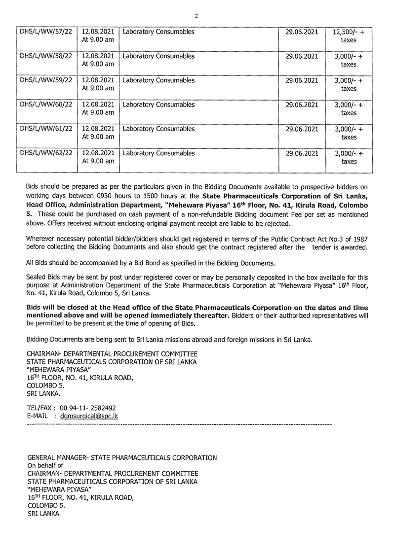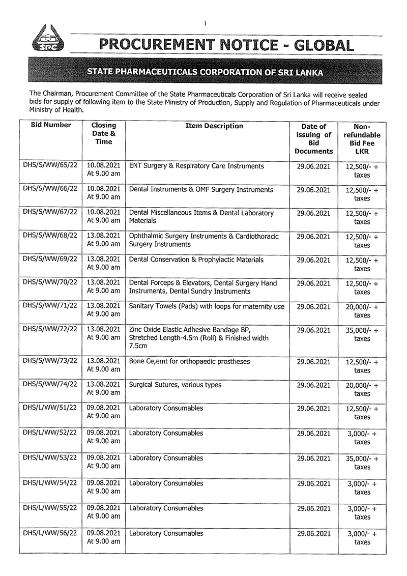 The Chairman, Procurement Committee of the State Pharmaceuticals Corporation, Sri Lanka is calling sealed bids for supply of following items to the State Ministry of Production, Supply and Regulation of Pharmaceuticals under Ministry of Health.