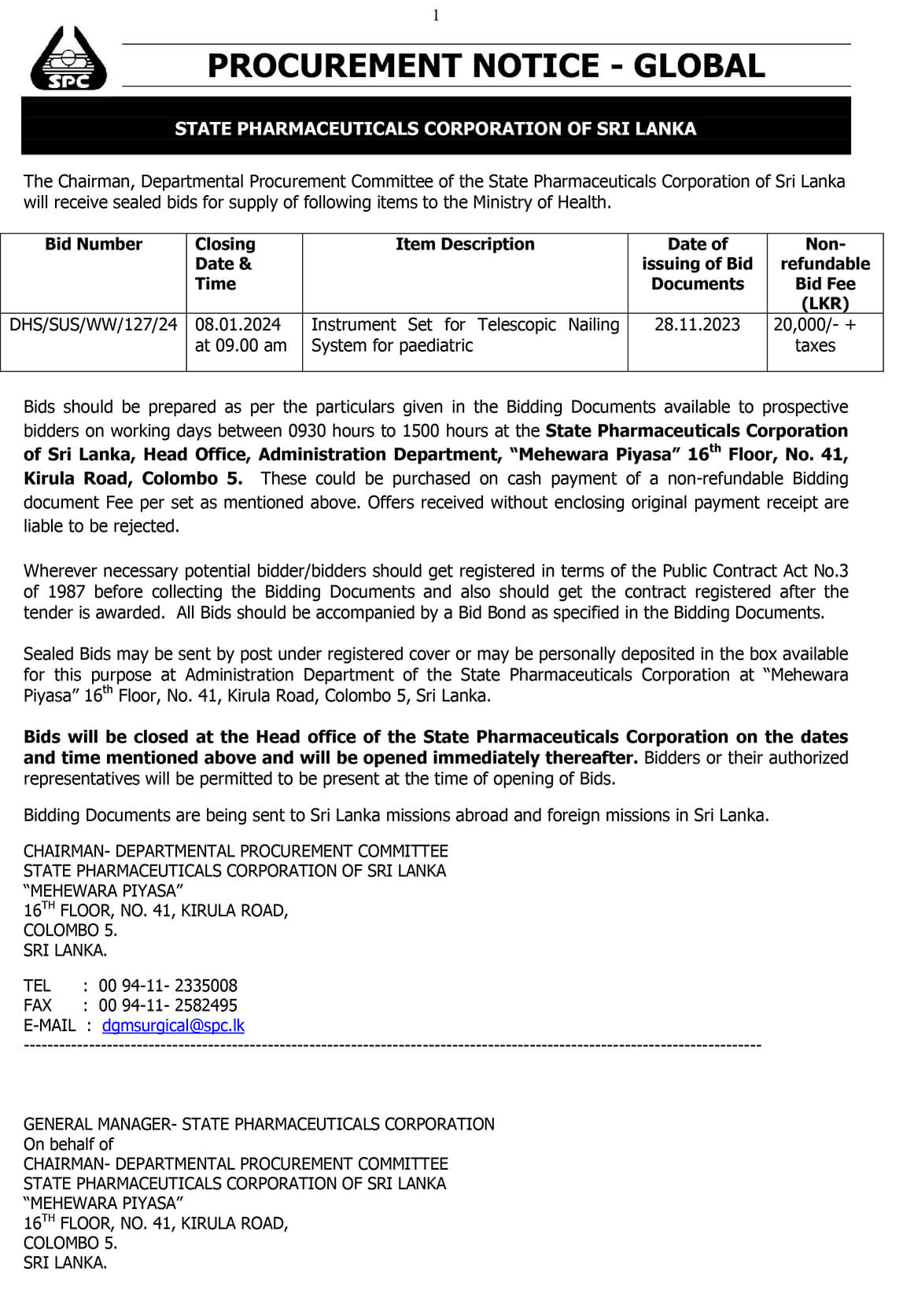 | 1. | DHS/SUS/WW/127/24 | Instrument Set for Telescopic Nailing System for paediatric | 08.01.2024 at 09.00 am | (To see the Document PLEASE CLICK HERE) |