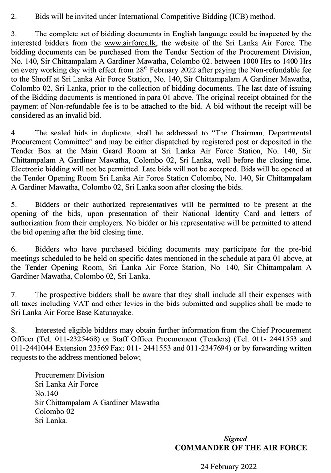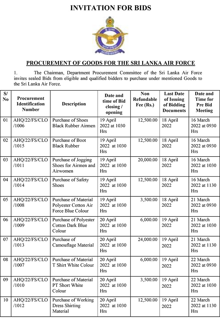 The Sri Lanka Air Force informs that the deadline for submission of bids to purchase undermentioned Goods to the Sri Lanka Air Force has been extended to respectively 04 May & 05 May 2022 at 1030 hrs Sri Lanka Time (GMT +5:30 Time Zone) (To see the notice PLEASE CLICK HERE)