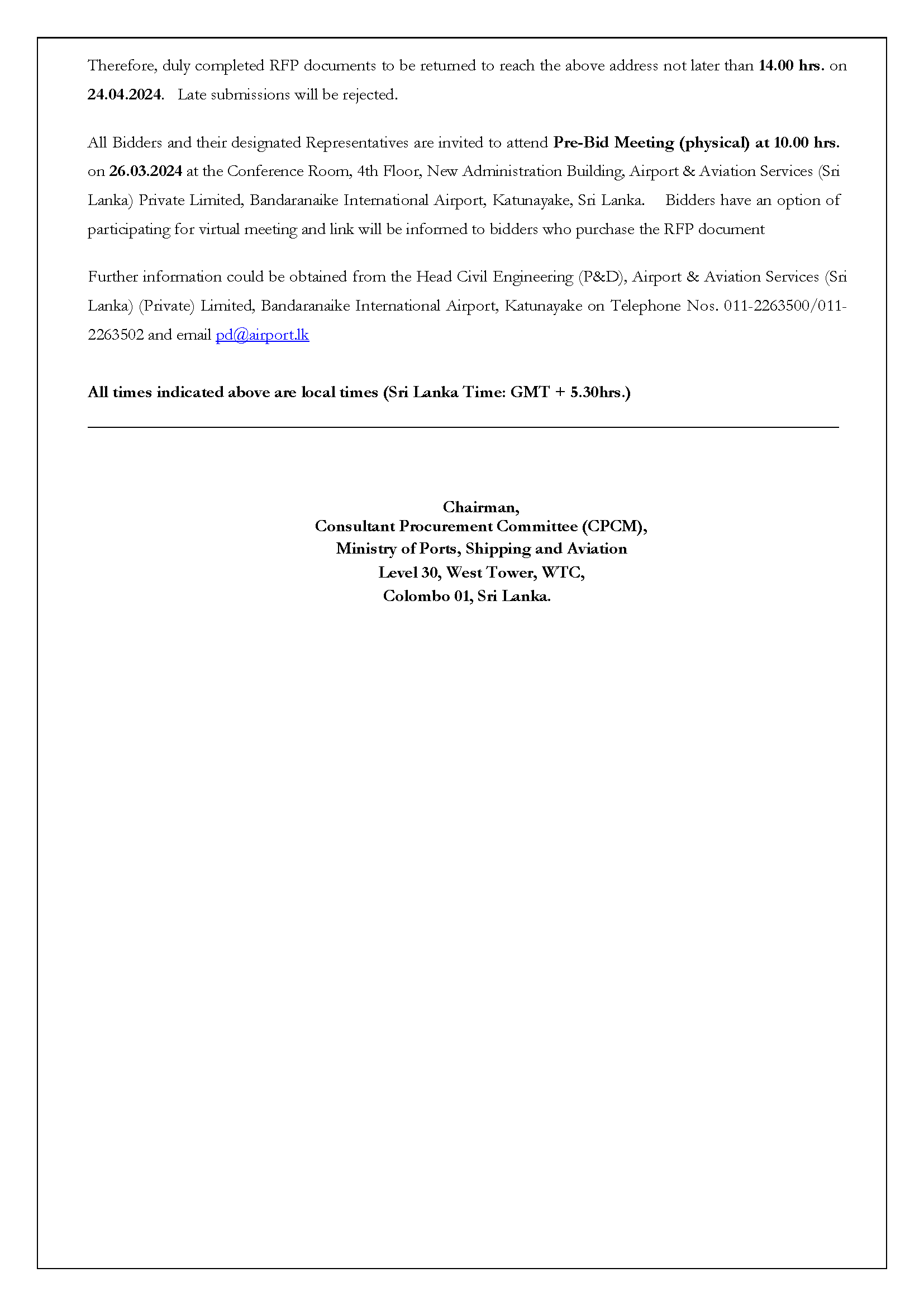 The Chairman, Ministry Consultants Procurement Committee (CPCM) is calling Proposals for the preparation and provision of a Master Plan for Bandaranaike International Airport, Katunayake, Sri Lanka