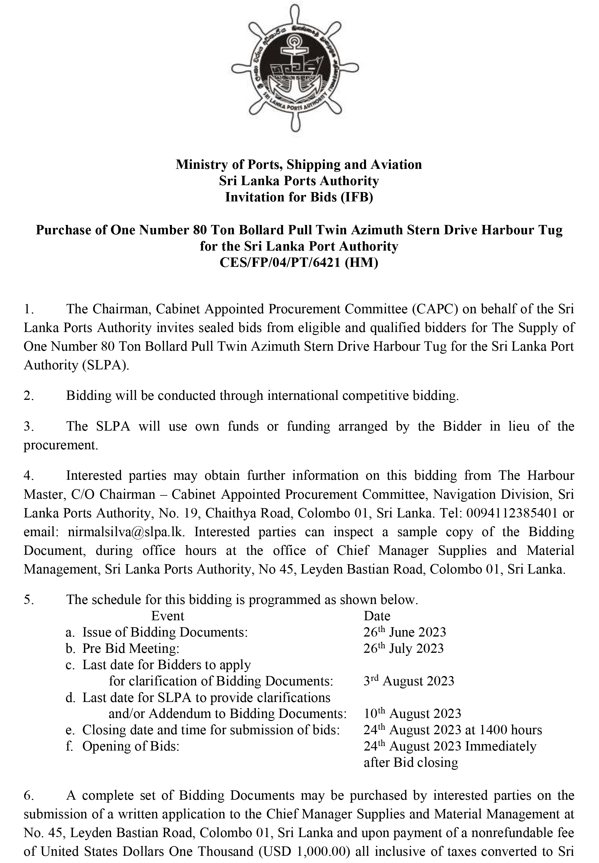 The Chairman Cabinet Appointed Procurement Committee on behalf of the Sri Lanka Ports Authority calling bids from eligible and qualified bidders for the supply One Number 80 Tons Bollard Pull Twin Azimuth Stern Drive Harbour Tug for the Sri Lanka Ports Authority.
