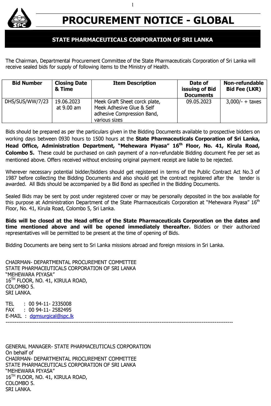 The Chairman, Procurement Committee of the State Pharmaceuticals Corporation of Sri Lanka calling sealed bids for supply of following items to the Department of Health Services for year 2024.