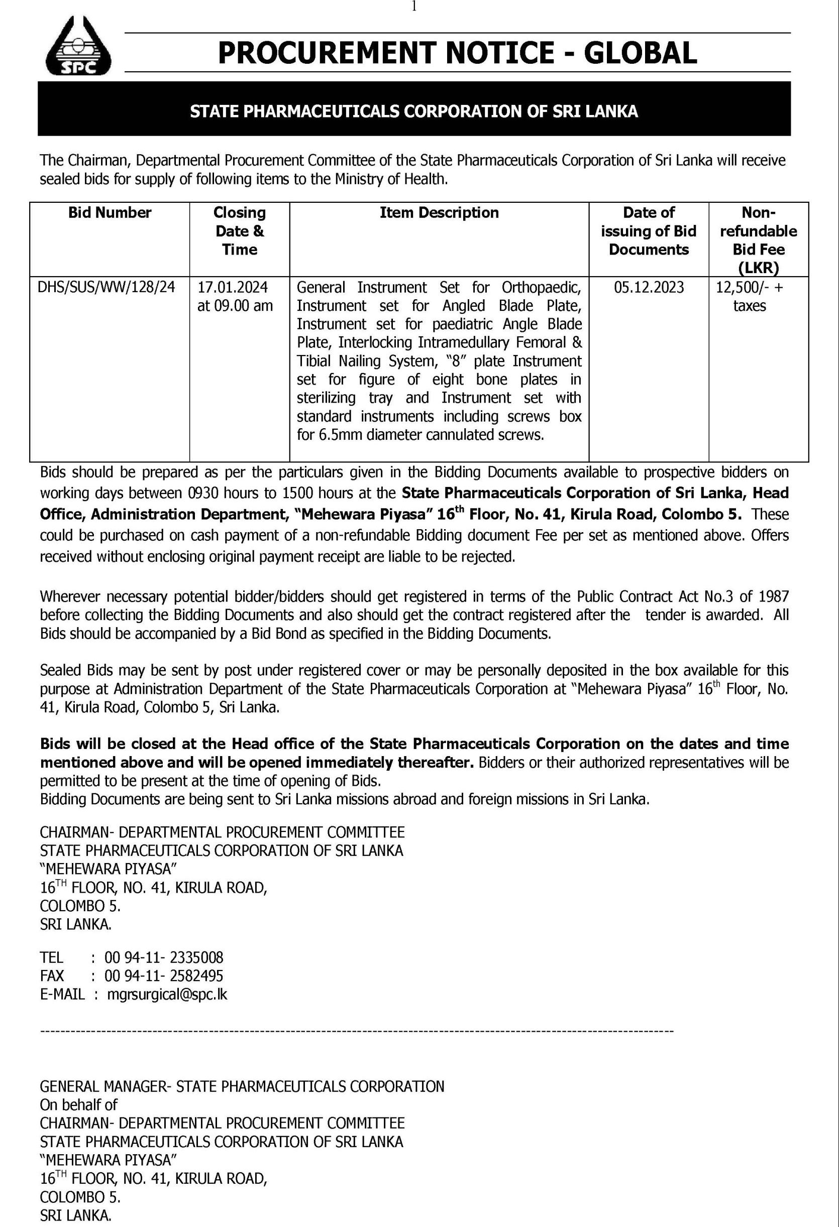 The Chairman, Departmental Procurement Committee of the  State Pharmaceuticals Corporation of Sri Lanka is calling sealed bids for supply of following item to the Ministry of Health.