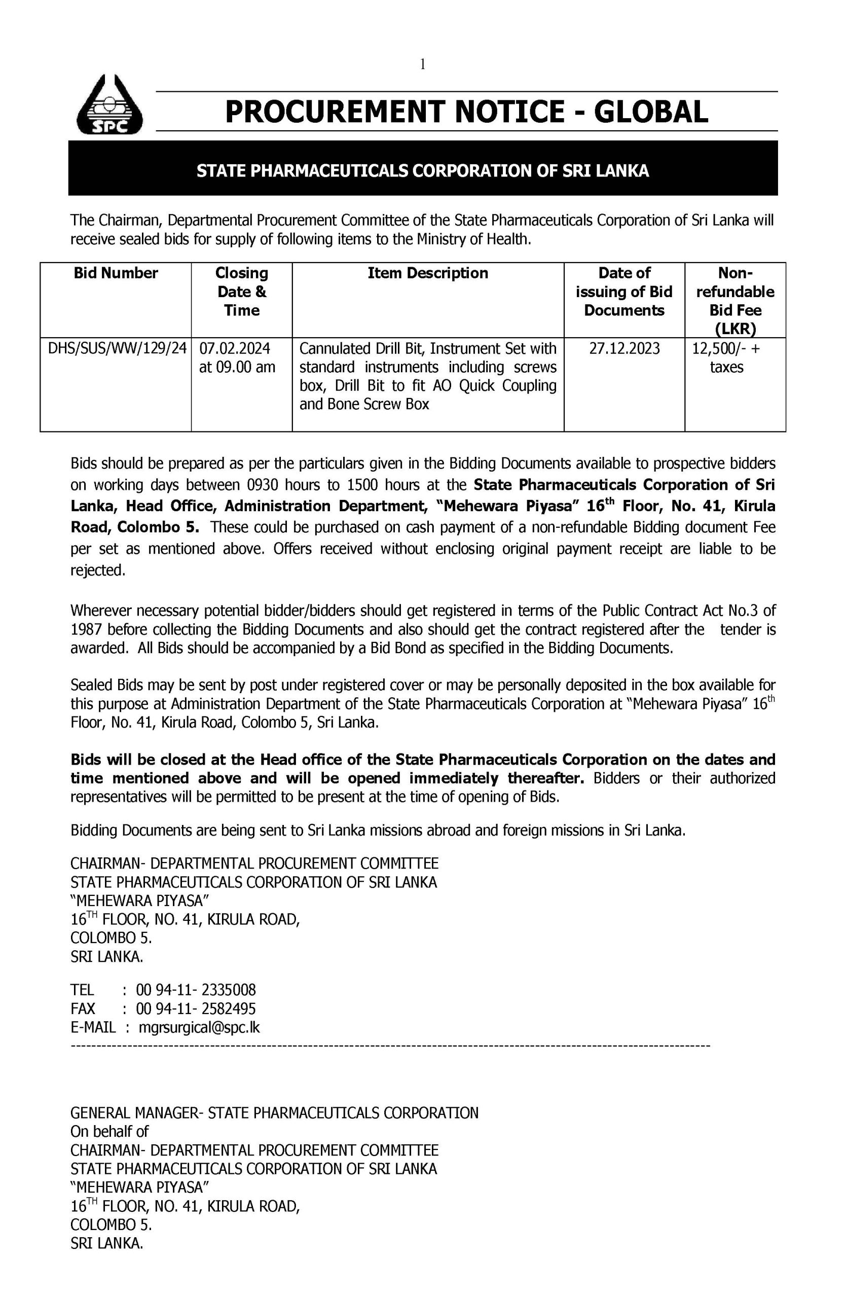 The Chairman, Departmental Procurement Committee of the State Pharmaceuticals Corporation of Sri Lanka is calling sealed bids for supply of following items to the Ministry of Health.