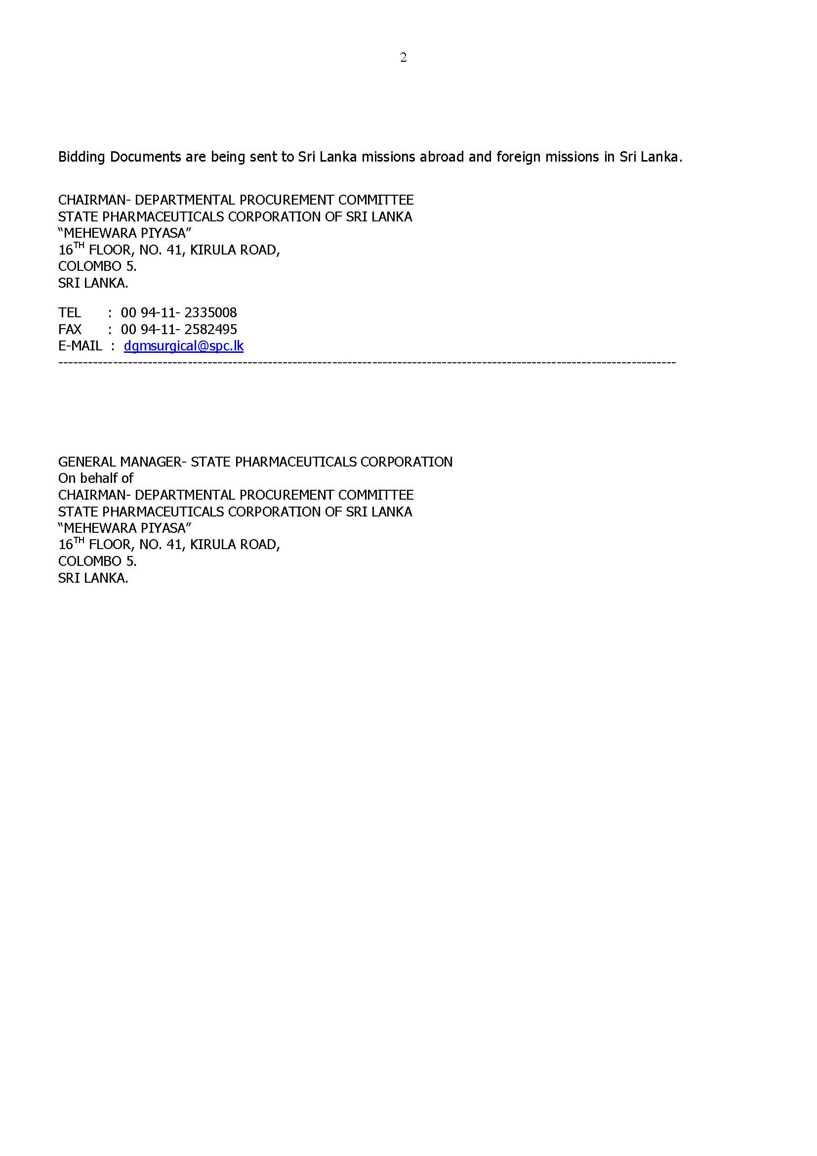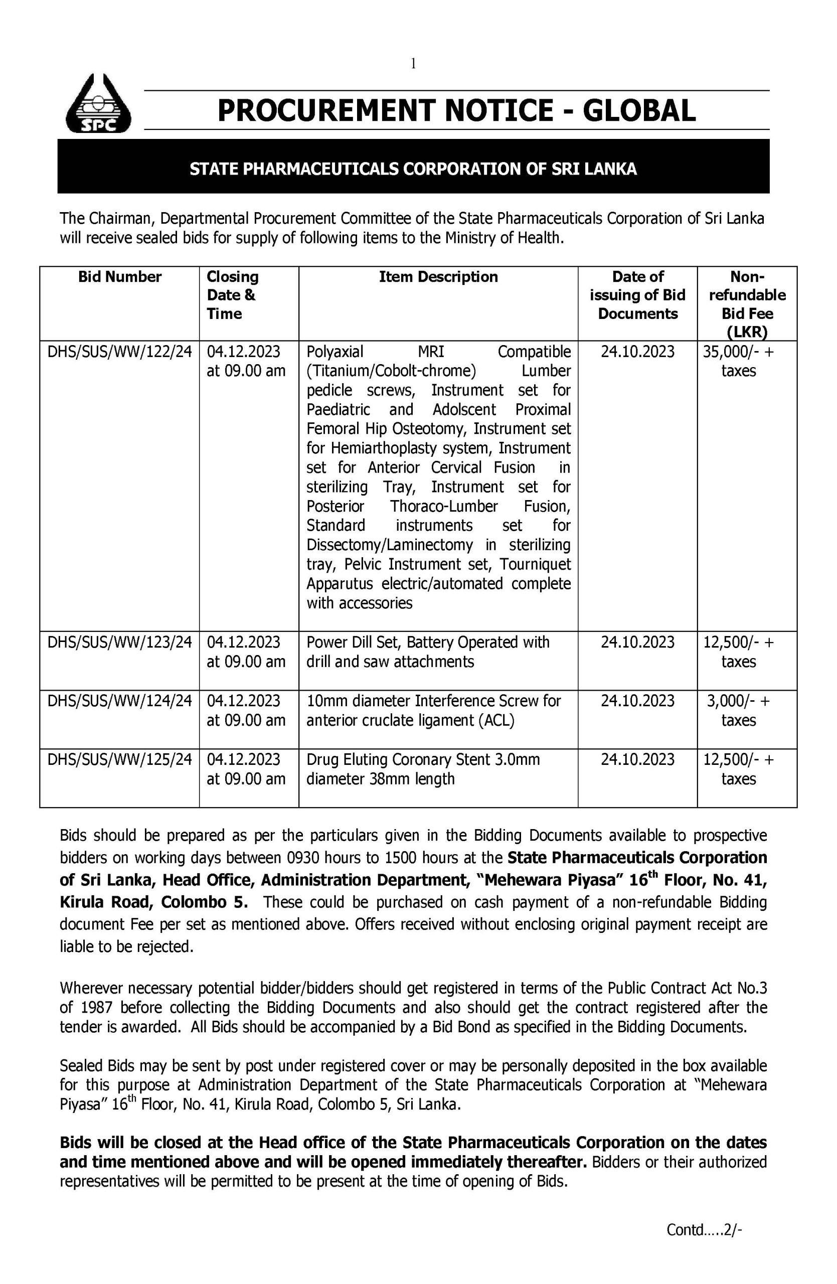 The Chairman, Departmental Procurement Committee of the State Pharmaceuticals Corporation of Sri Lanka is calling sealed bids for supply of following items to the Ministry of Health.