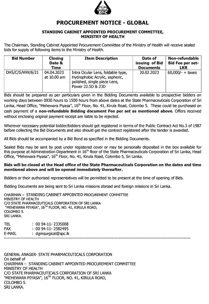 The Chairman, Standing Cabinet Appointed Procurement Committee of the Ministry of Health calling sealed bids for supply of following items to the Ministry of Health.