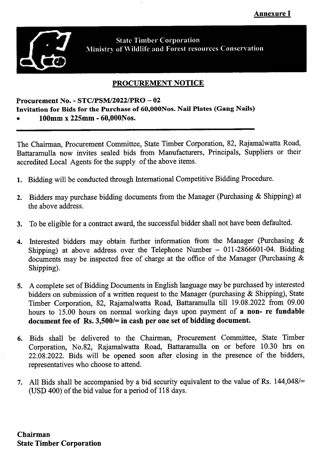 The Chairman, Procurement Committee, State Timber Corporation, 82, Rajamalwatta Road, Battaramulla is inviting sealed bids from Manufacturers, Principals, Suppliers or their accredited Local Agents for the supply of 60,000 Nos. Nail Plates (Gang Nails)