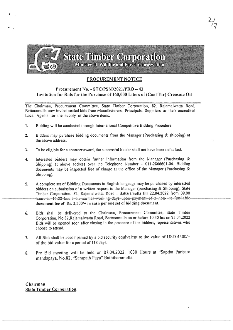 The Chairman, Procurement Committee, State Timber Corporation, 82, Rajamalwatta Road, Battaramulla is inviting sealed bids from Manufacturers, Principals, Suppliers or their accredited Local Agents for the supply of 160,000 Litres of (Coal Tar) Creosote Oil.